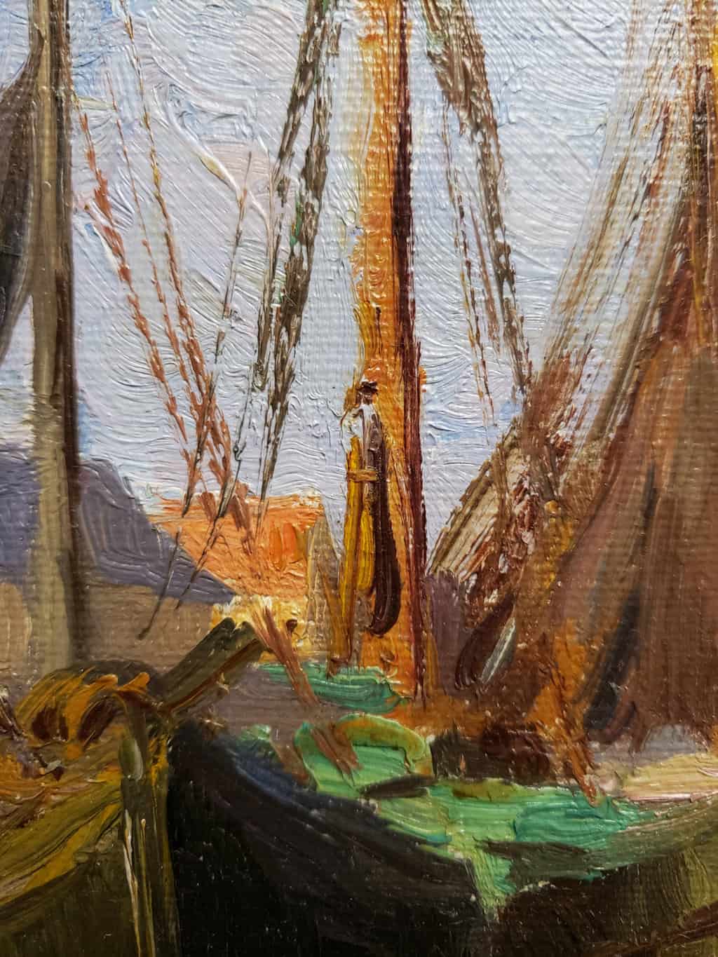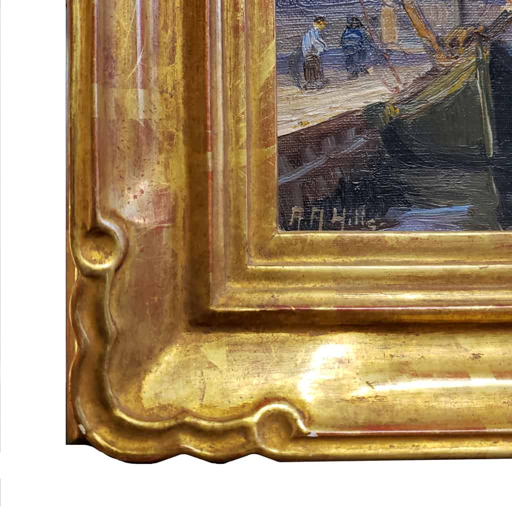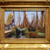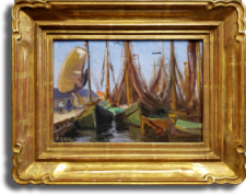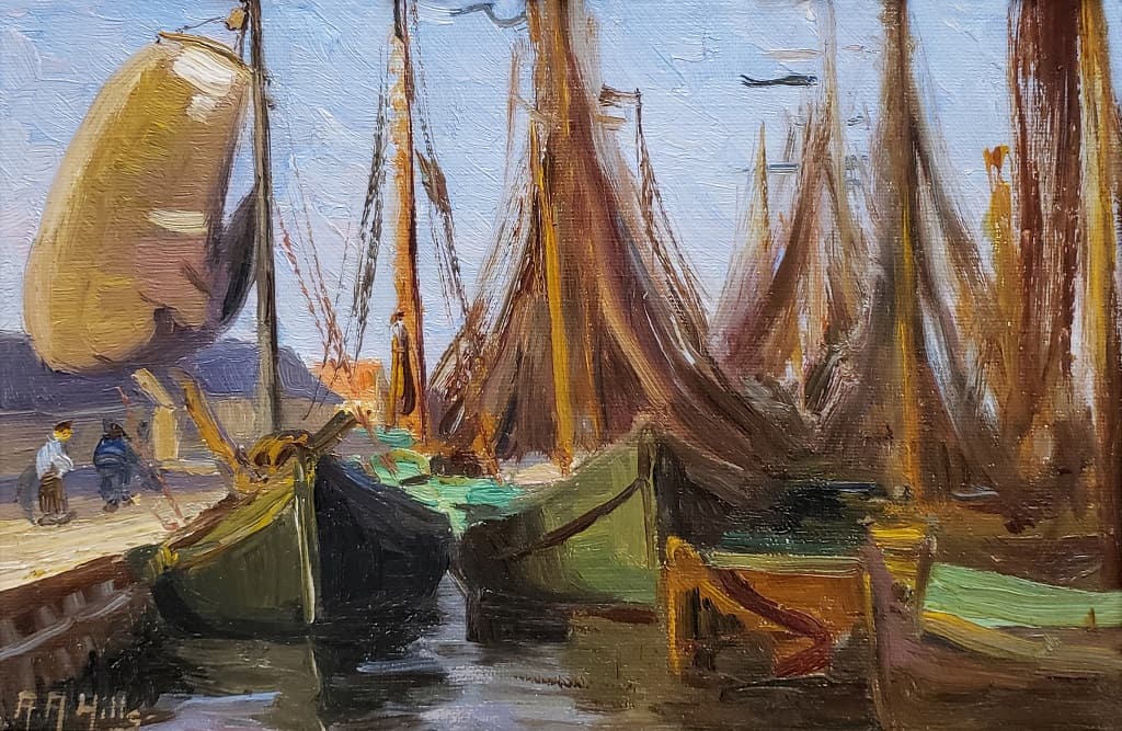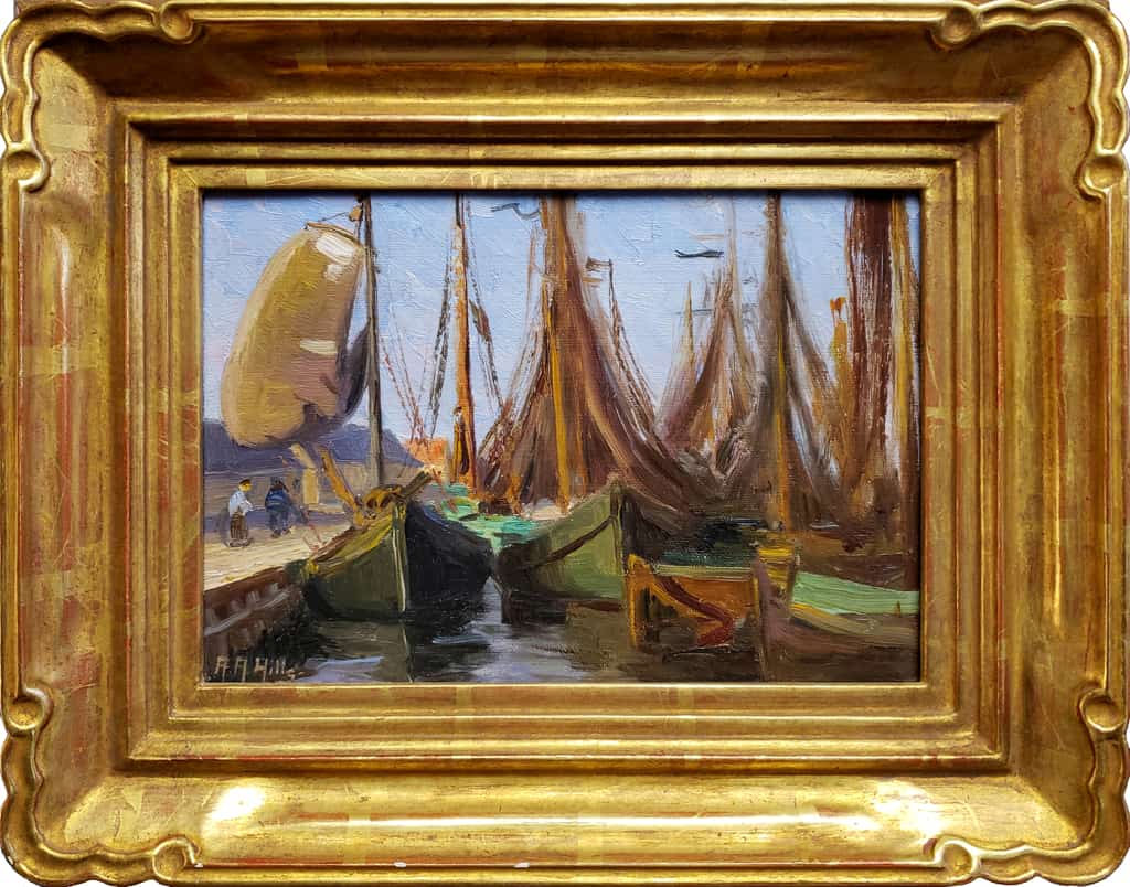 This plein air study made by Anna Hills of a village in North Holland, circa 1911, shows an array of fishing boats moored to a quay that has returned from their day of fishing and drying their nets in the late afternoon sun. The boat with the billowy sail on the left indicates that it is windy out, and perhaps the two men on the quay looking on are hoping to launch it. With its saturated colors in green and ochre, fascinating narrative, and complex, detailed composition, this small painting has an impressive presence. In 1908 Hills traveled to Europe to study at the Académie Julian in Paris and spent four years in Europe where she painted in the Netherlands and England.