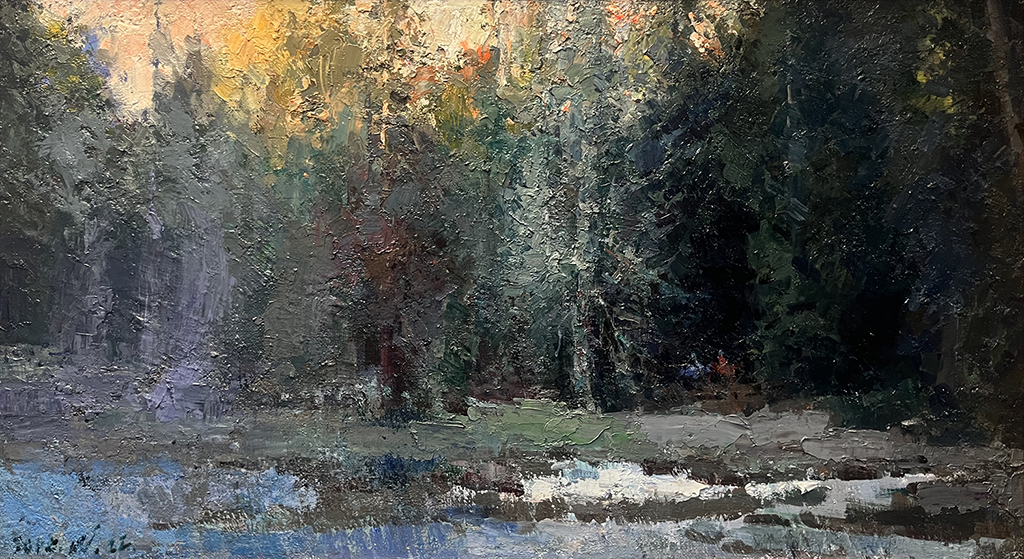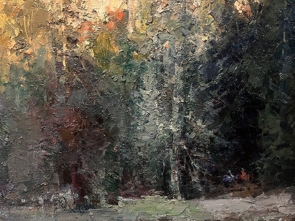 “In the early spring, the ancient Sequoia forests awaken as the cowboys’ team sets off in the morning light. The color palette of the painting evokes a quiet, mysterious atmosphere, while the soft, misty light in the sky adds a romantic and ethereal beauty to the scene.”