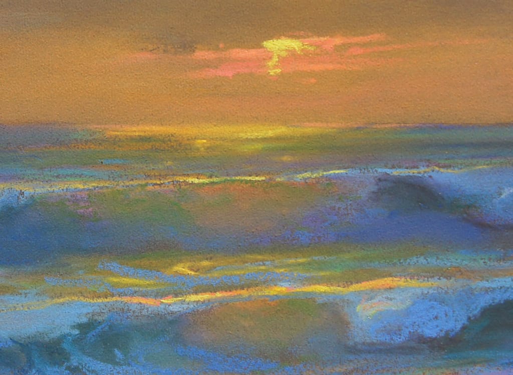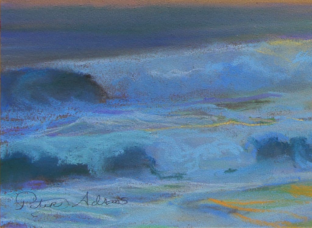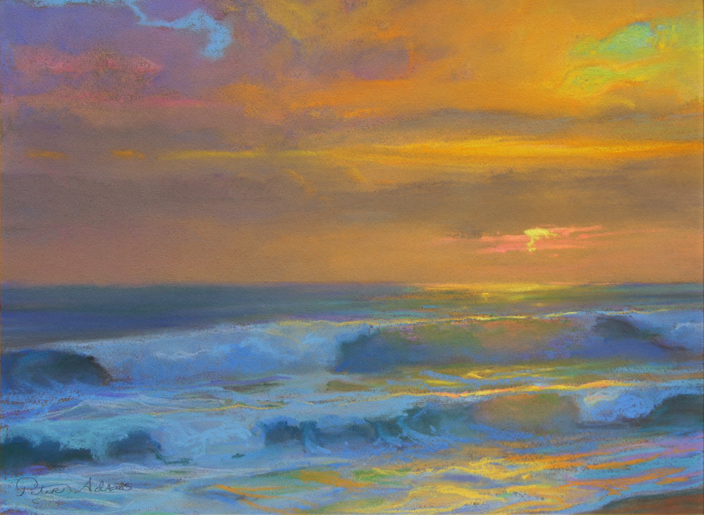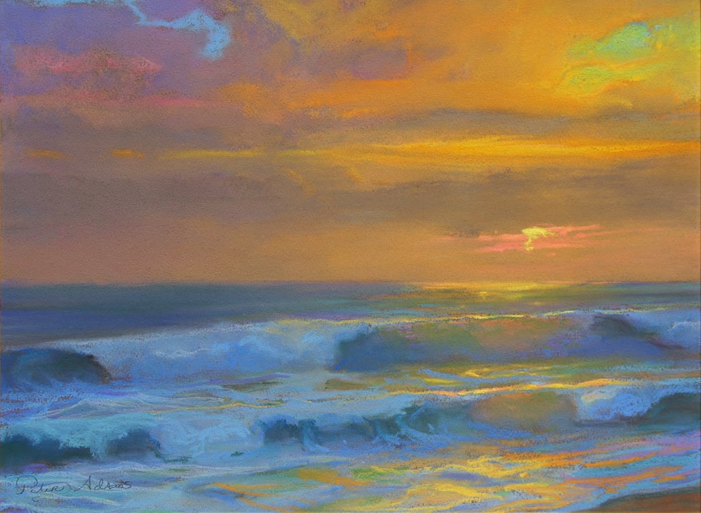 The process Peter Adams applies in creating his plein air pastel paintings is immediate and impassioned. Using Canson Mi-Teintes Archival paper, he first applies broad sweeps of his highest keynotes and adds layers of varying shades to interpret the vivid colors of nature he is experiencing at that moment. Initially, the work appears in abstract form. Then, he quickly “paints” the scene directly with the tips of his fingers, modeling and designing shapes while carefully assigning each finger to a specific color shade in order to maintain the purity of the colors. To create his signature inner glow, Adams rubs the medium down to the first layer of his higher-key notes—and the final result is a one-of-a-kind poetic work of art filled with intensity and emotional impact.