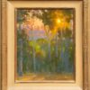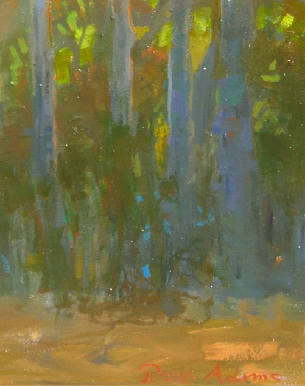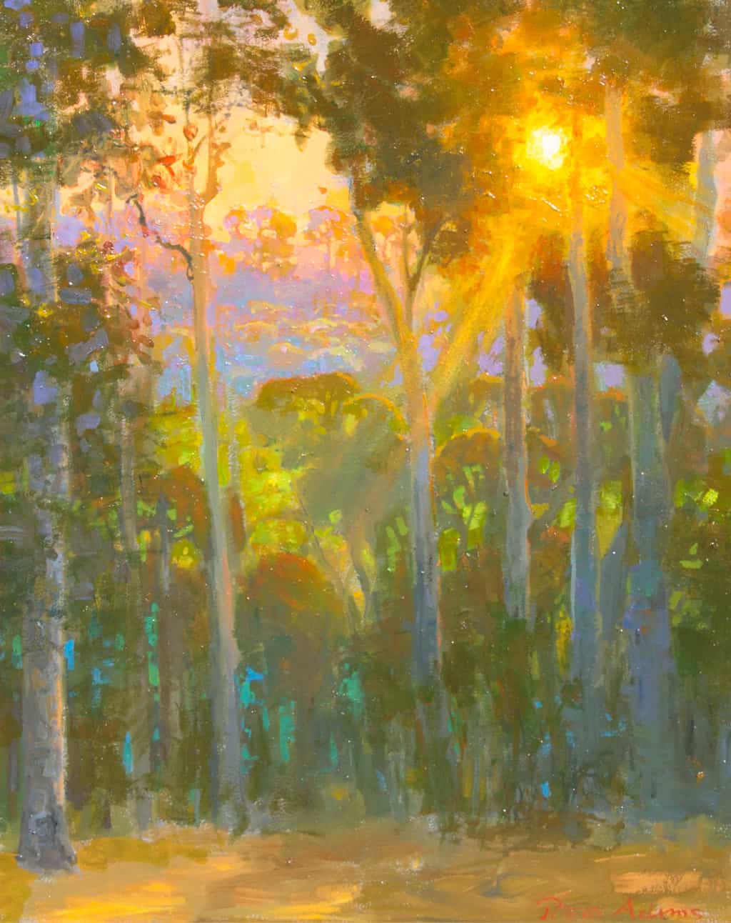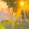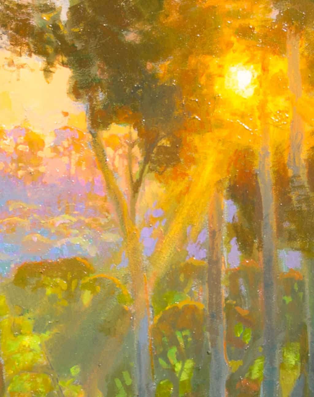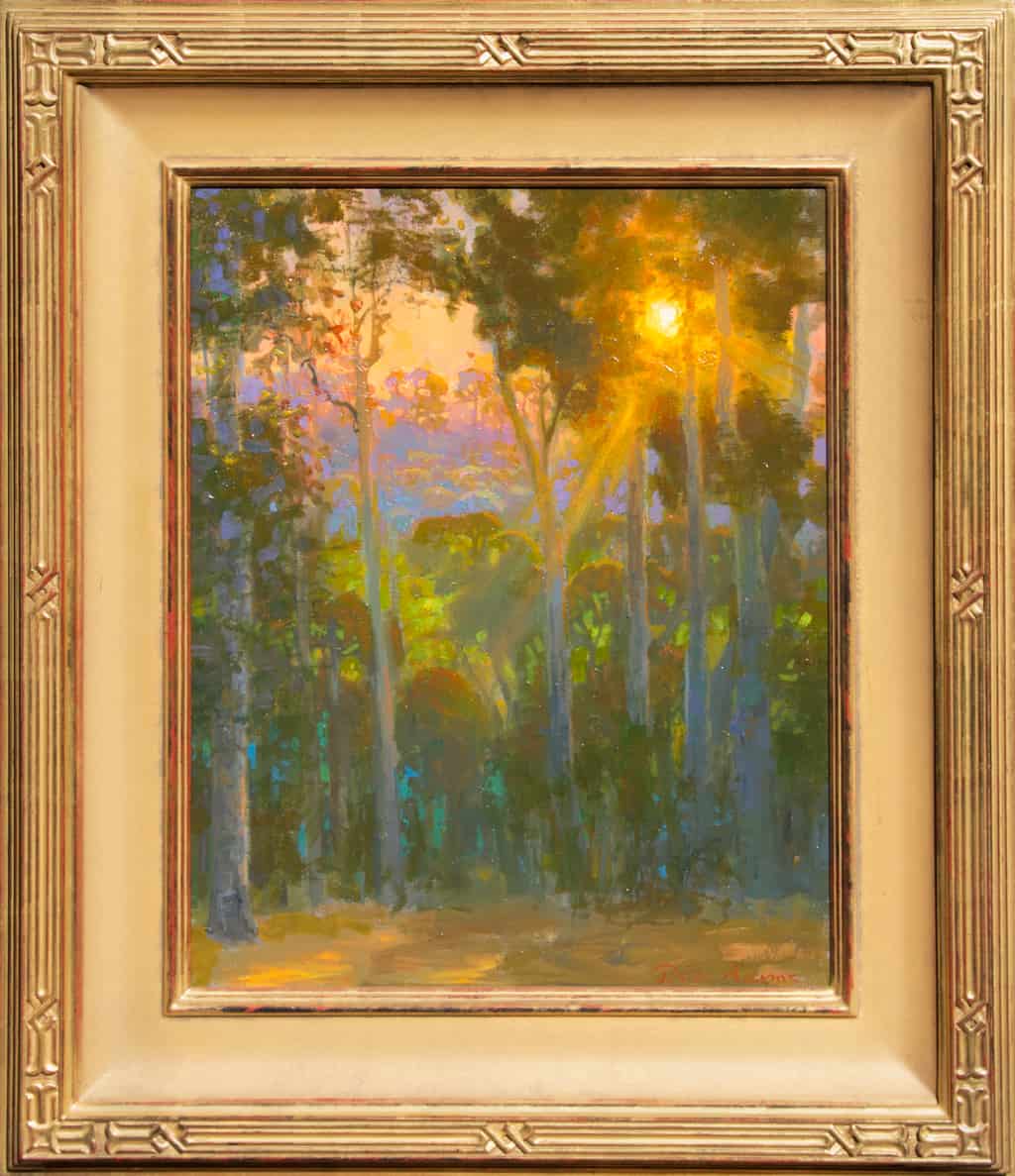 "This plein air oil painting was done in northern Carlsbad's eucalyptus forest, a location that is sometimes referred to as Hosp Grove. In 1908 F.P. Hosp planted 219 eucalyptus trees in this California site to be used by the Santa Fe Railroad Company as railroad ties. However, it was discovered that eucalyptus wood was useless for this purpose, and so the young forest was never harvested and grew and proliferated on its own. Because of their light bark, graceful limbs, clusters of foliage, and lyrical silhouettes, eucalyptus have always been my favorite trees to paint. Being surrounded by a forest of eucalyptus trees is even more exciting. Then, to have the sun’s evening rays illuminating through the foliage adds an extra dimension. To me, it seems like a glimpse into another world—a higher realm—thus, the name Elysium Moment."