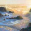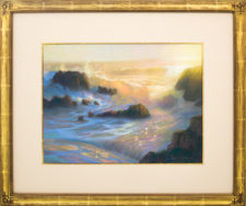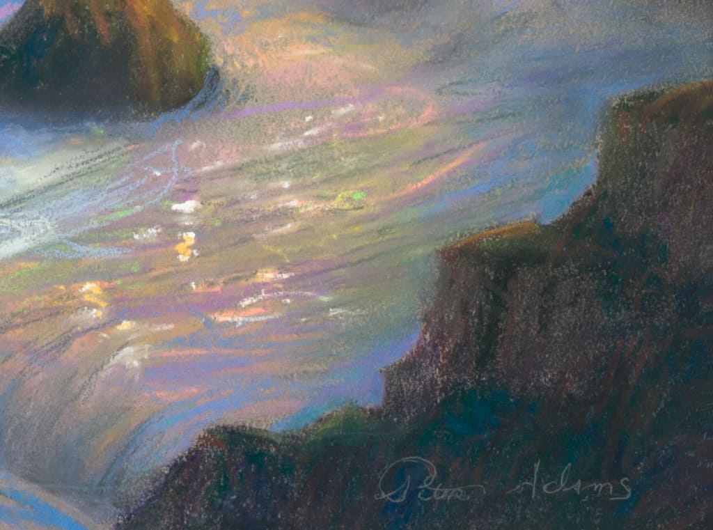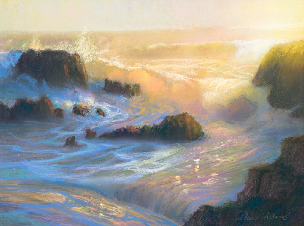 If you look long enough at this dynamic plein air pastel by Peter Adams, titled Ephemeral Light, Leo Carrillo Beach, you can be easily lifted by the incoming wave into the sunlight. The scene instantly transports you to Malibu, one of the most picturesque places along the Pacific Coast.