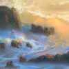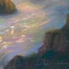 The water sweeps over the rocks in a smooth but vigorous floating motion as they engage in a millennia-long private dialogue. The water here indeed holds a mystery. What makes the sea spray from crashing waves and shimmer with shades of blue, pink, purple and vibrant orange? Nature unveils its playful side as the setting sunlight reflects a blazing halo—and only the artist can interpret its mysteries.