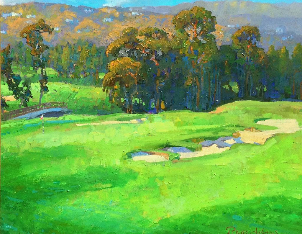 Painted en plein air from the balcony of the Los Angeles Country Club overlooking the North Course. Peter Adams depicts the character of the scene as vibrant and full of life--and beckons the viewer in for a round. The verdant undulating fairway, groupings of sinuous eucalyptus trees, and the gentle Hollywood Hills as the backdrop together express the uniqueness of this private golf course that's nestled in the heart of Beverly Hills.