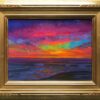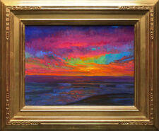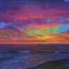 This plein air oil painting is charged with immediate and brilliant energy. The relationship between the hot and cool colors projected on the rolling waves and sweeping sunset gives this work an emotion that is lively and uplifting. The painting was created during a late summer stay at the artist's getaway beach house in north San Diego County.