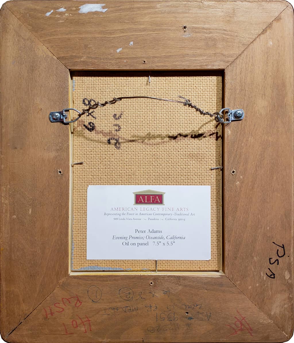 Peter Adams Available Work Archives Biography Press and Publications Commissions Art Reviews Studio Visit Peter AdamsEvening Promise; Oceanside, CaliforniaOil on panel8" x 6", artworkContemporary$2,300 In stock Evening Promise; Oceanside, California quantity Purchase Now Request More Information Provenance Acquired by American Legacy Fine Arts directly from the artist Exhibited A Collector's Feast, American Legacy Fine Arts, November 16 – December 15, 2018 Need help? Call our ALFA specialists +1 626.577.7733 Additional Available Artwork by Peter Adams