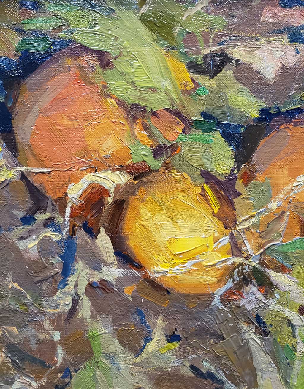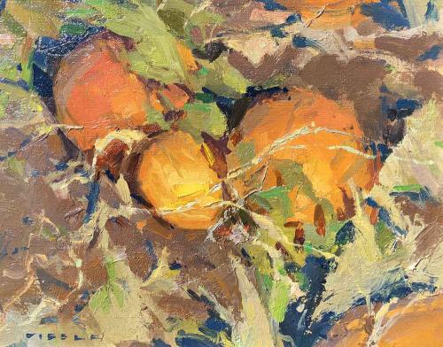 "This piece was painted in the pumpkin patch of my family farm in Utah. I can never get enough of the colors and shapes in the fields of pumpkins as the leaves dry and decay leaving the bright orange spots to shine."