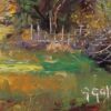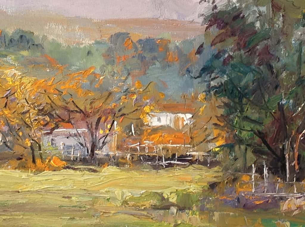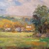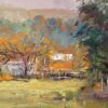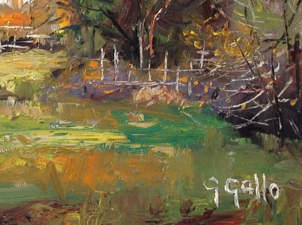 Gallo warmly depicts a farming house surrounded by the scenic, unspoiled California landscape. The blurred brushstrokes reflect the look of early morning mist. The farmhouses cannot be differentiated from the surroundings. Gallo illustrates the overwhelming beauty of nature over mankind. The surrounding environment visually consumes he farmhouses and displays nature's inability to be suppressed.