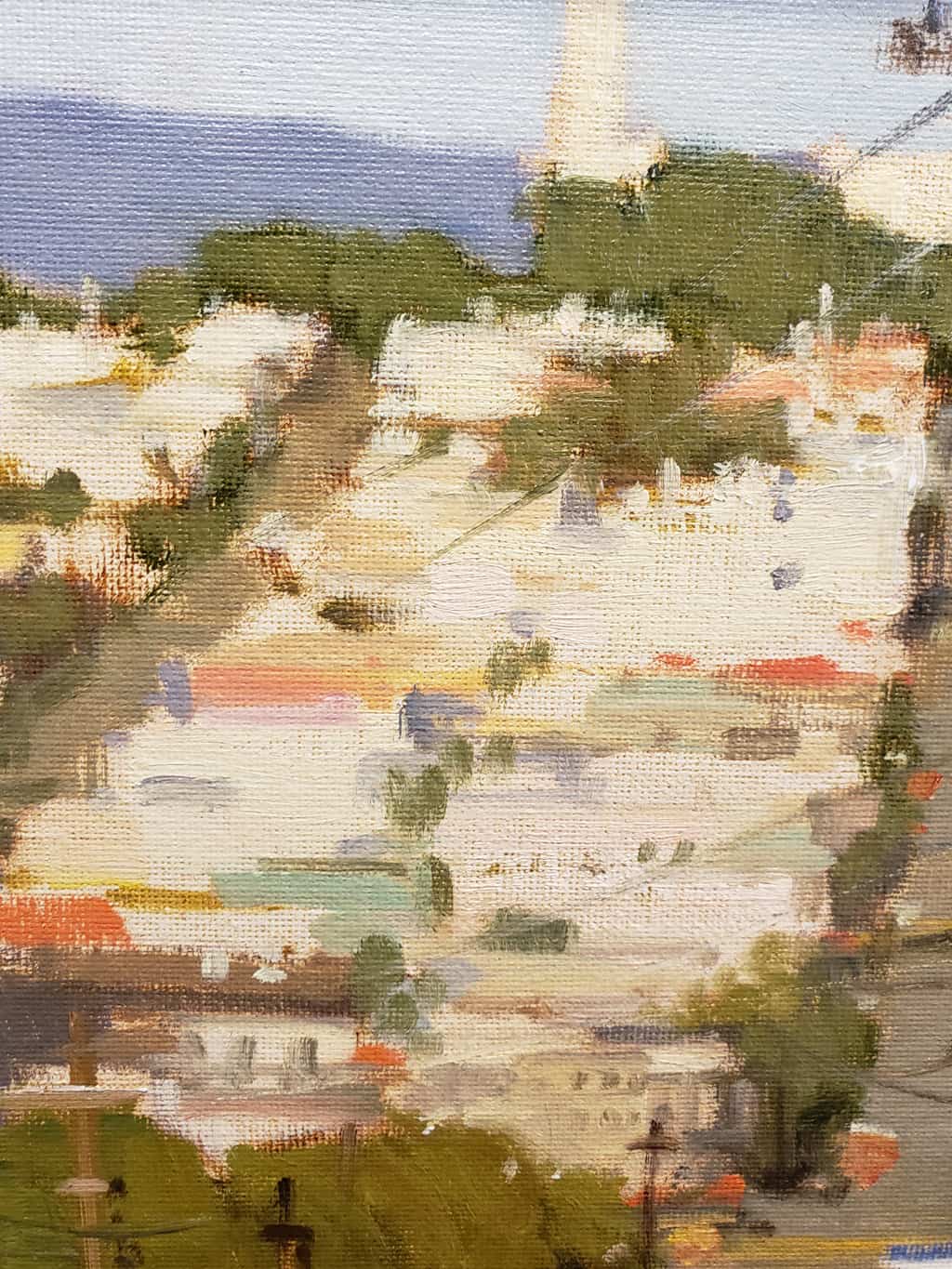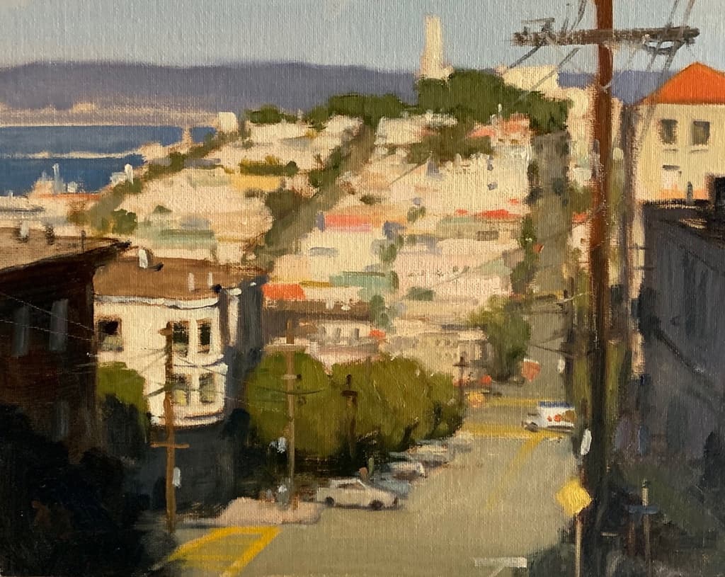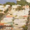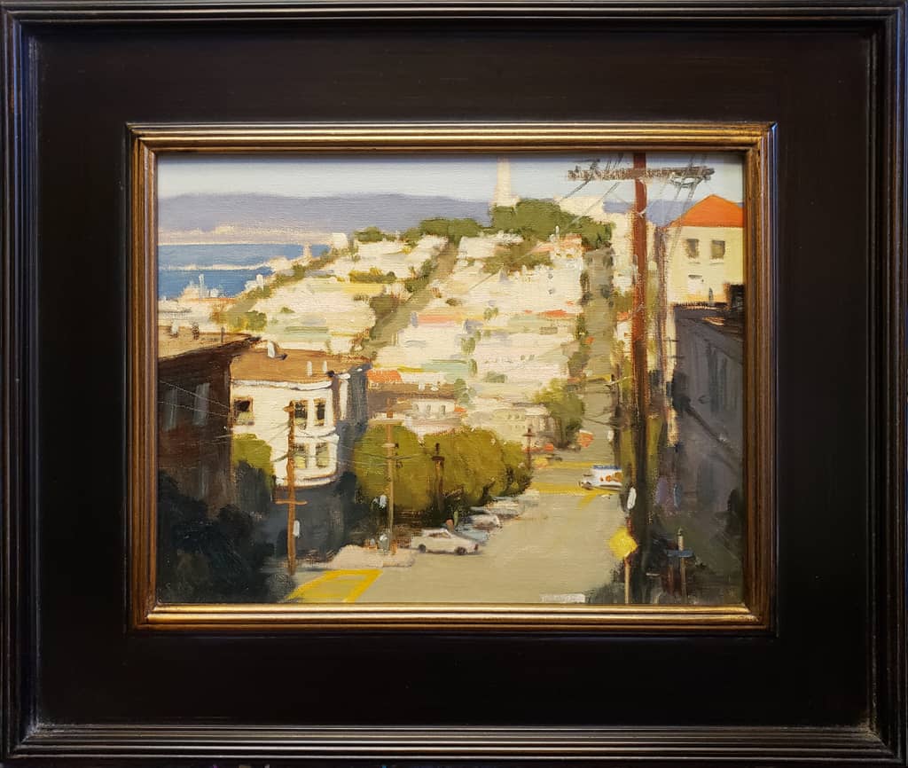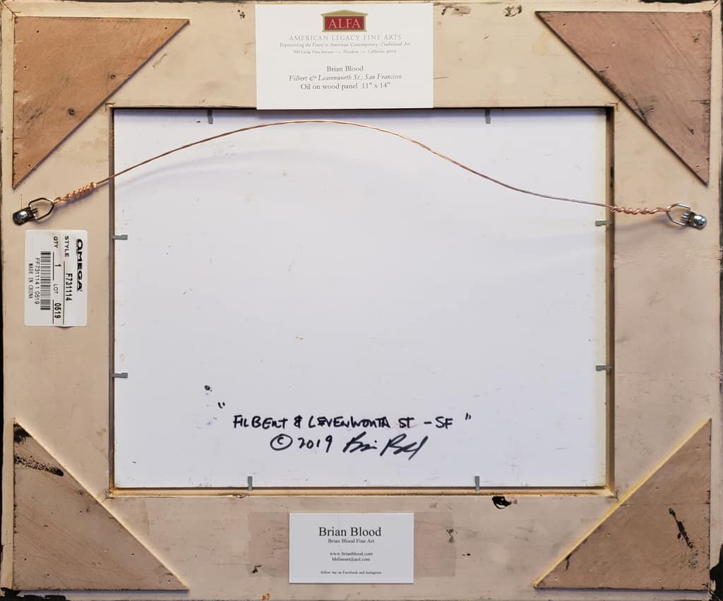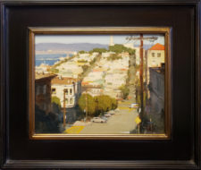 "Nestled on Russian Hill is the corner of Filbert and Leavenworth. This is a favorite scene of mine to paint. First, I lived just around the corner from it, and secondly, because I feel the composition dramatically illustrates the scenic beauty of San Francisco."