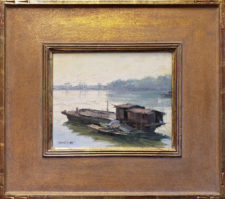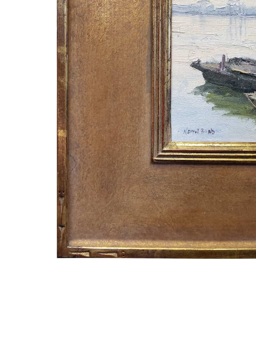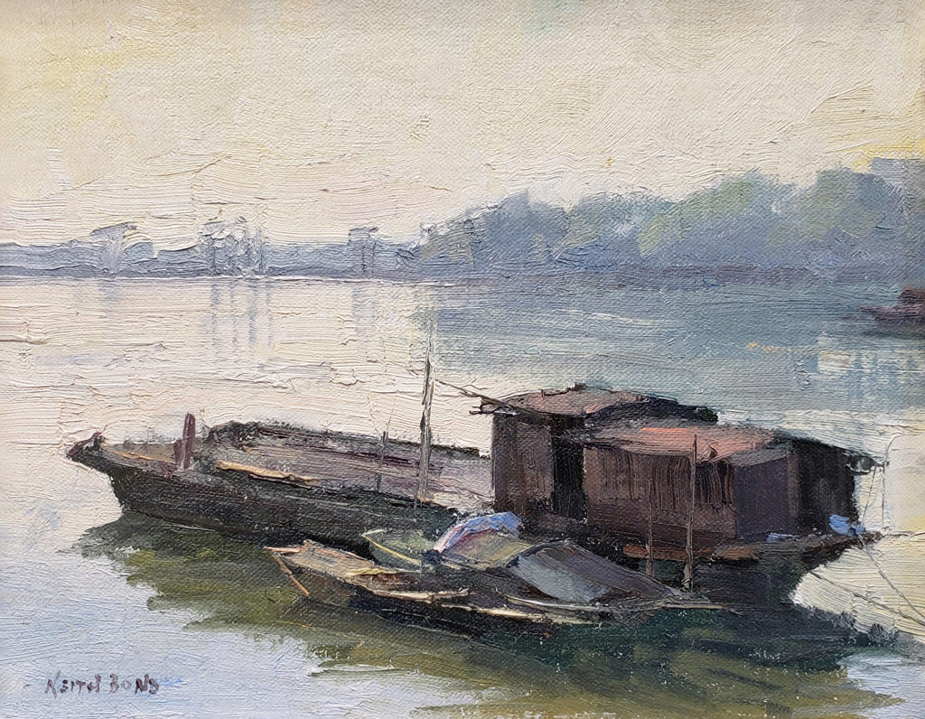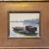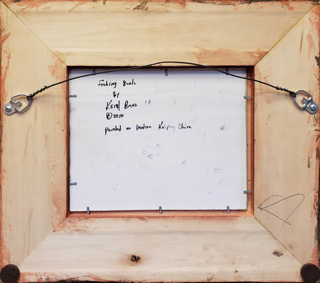 "Contrasted with the struggles and hardships of this vanishing way of life is the serenity and dignity of this fishing community. This lone grouping of boats in the calm, reflective waters seems to honor them in a fitting way, while also alluding to the setting of the sun on this traditional lifestyle. This painting was painted on location (en plein air)".