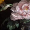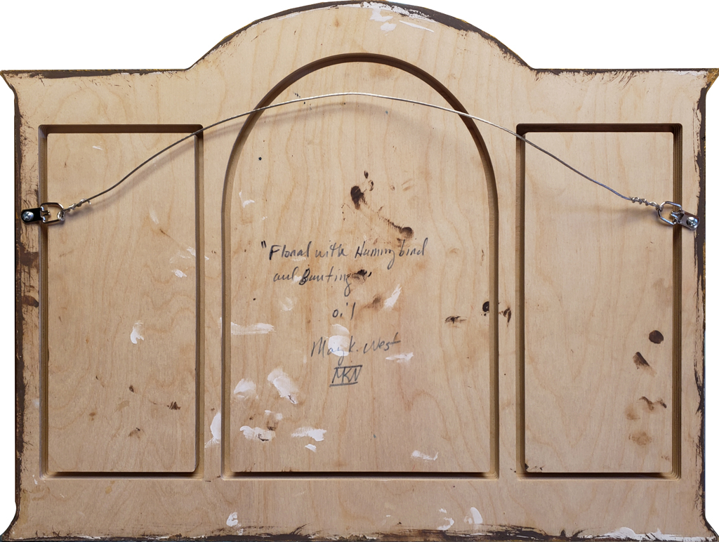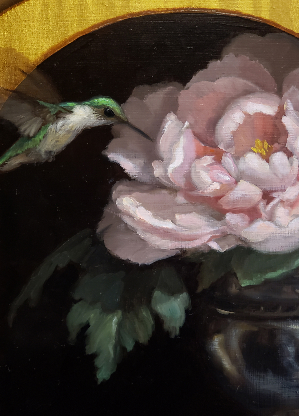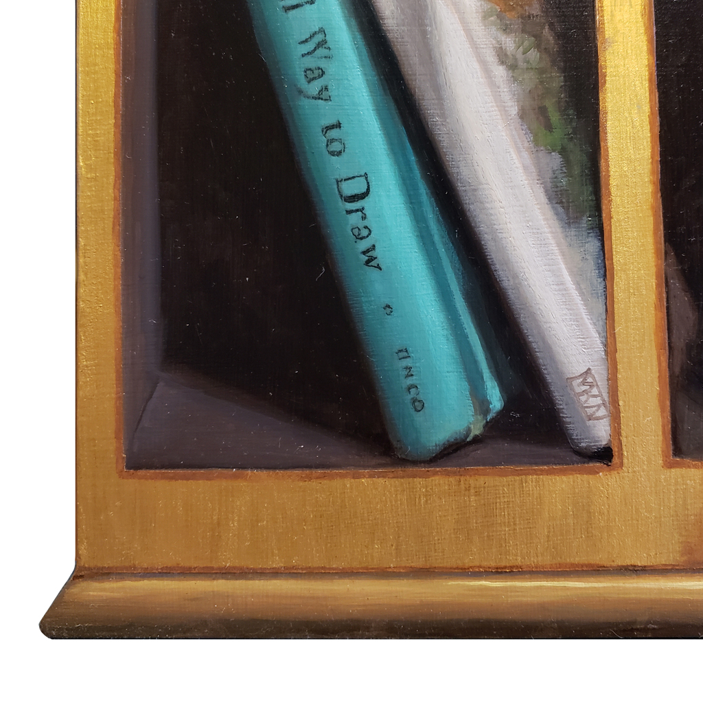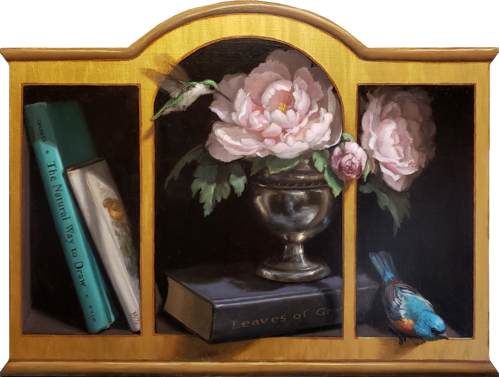 “The idea of emergence from darkness into light is a theme that is always close to the surface of my consciousness, and is given the opportunity to be expressed in the deep shadows of a bookcase being lit from above to show the natural beauty and grace of flowers and birds. The setting is casual, but elegant, with a silver vase from my family’s collection of repoussé, and the books each have a special meaning. The first, a book about drawing that embraces my right-brained way of seeing things, the second, a book about songbird identification, and the third is a book of poems by Walt Whitman, a fellow practitioner of the metaphysical. Finally, the theme of emergence is completed with the Lazuli Bunting emerging from the scene into the third dimension.”