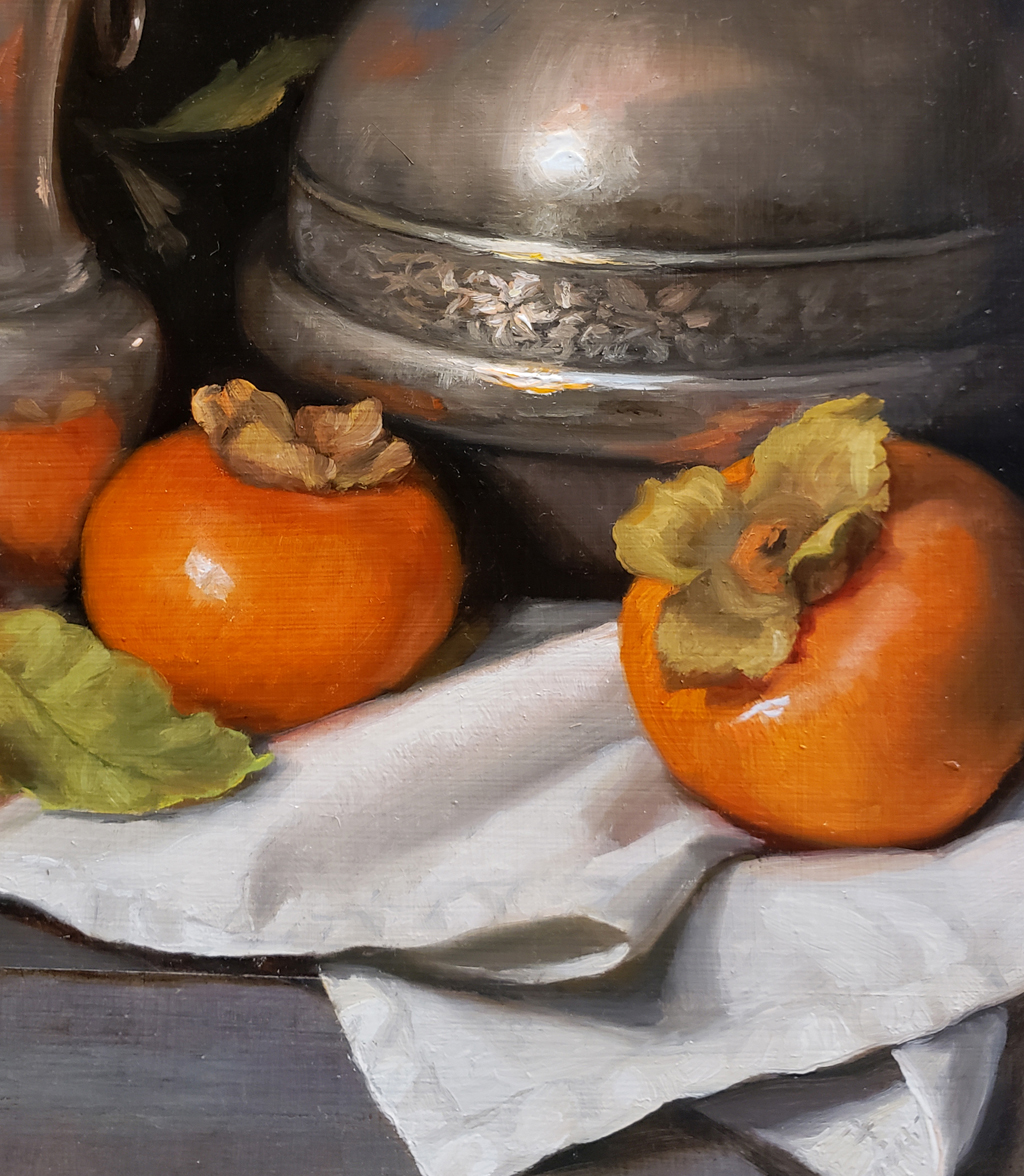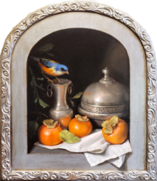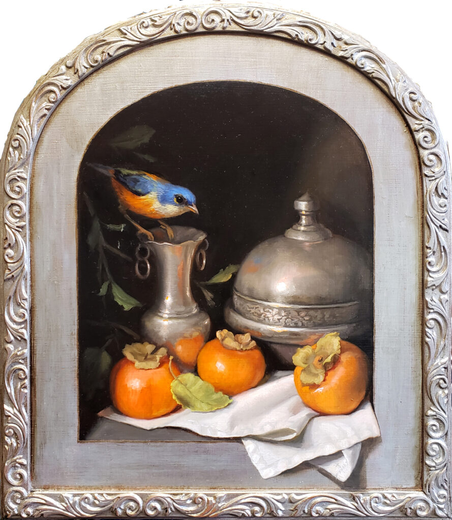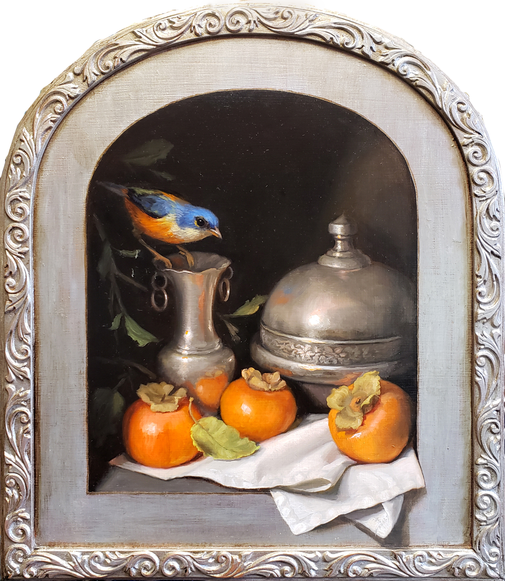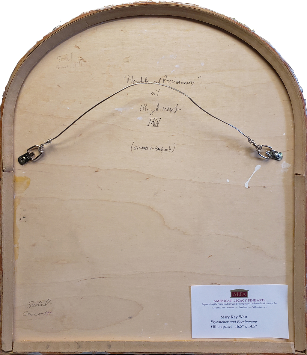 Mary Kay West Available Work Archives Biography Press and Publications View in Room Sizing is approximate. See specs for exact dimensions. Twitter Email Mary Kay WestFlycatcher and PersimmonsOil on panel16.375" x 14.25" x 1", artwork16.375" x 14.25" x 1", framedContemporaryNot AvailableRequest More Information Provenance Acquired by American Legacy Fine Arts directly from the artist Description "A Blue Flycatcher is poised ready to sample fresh persimmons while surrounding silver reflects the colorful scene." —Mary Kay West Exhibited The Poetry of Still Life, American Legacy Fine Arts, Pasadena, California, April 22 – May 21, 2023 Need help? Call our ALFA specialists +1 626.577.7733 Available Artwork by Mary Kay West