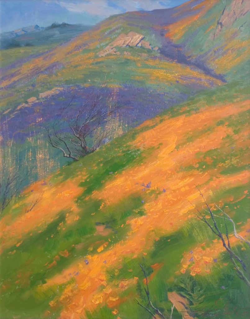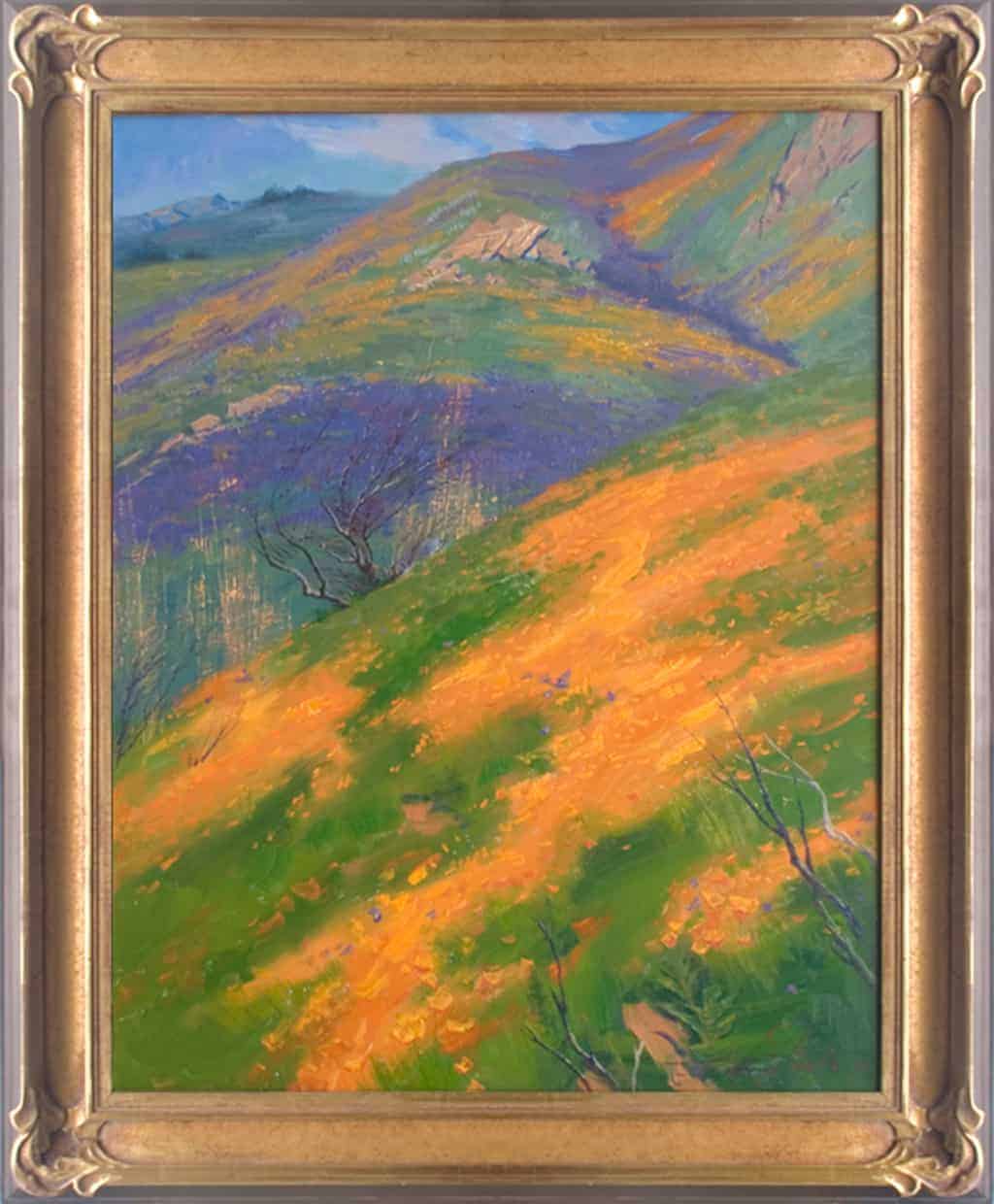 Description This work was painted from the Irvine Conservancy in the spring of 2008, six months after the devasting Santiago Fire, caused by an arsonist, that destroyed more than 28,000 acres of Orange County from October 21 to November 9, 2007. "Force of Life" is a testament to nature's will to grow and flourish. Steele expresses a sense of strength and beauty by heightening carpets of California's brilliant orange poppies and purple lupine amidst charred chaparral and manzanita.