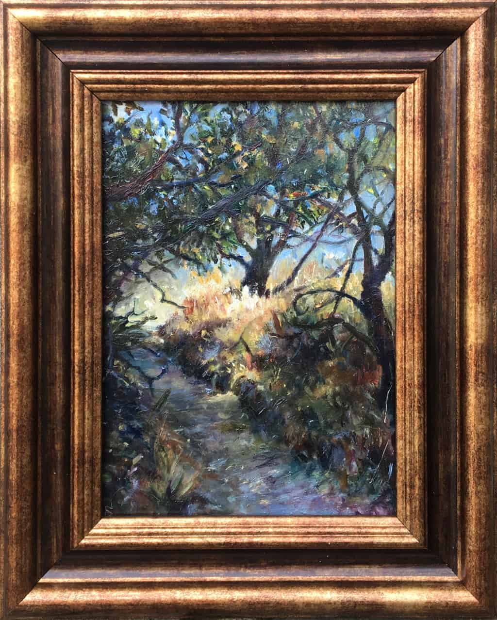 "After a tiring hike in the Topanga Mountains, I finally found a decent spot to paint the subject I was looking for—a magical, intimate welcoming scene like in a fairytale."