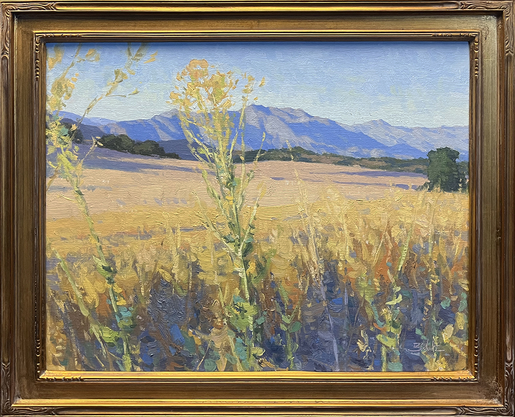 "In midsummer, the colors of California have transformed from vibrant spring greens to the dry hues of our golden state. This painting is an exploration of that golden glow across the Ojai Valley."