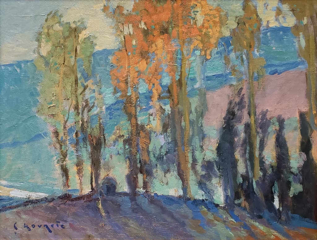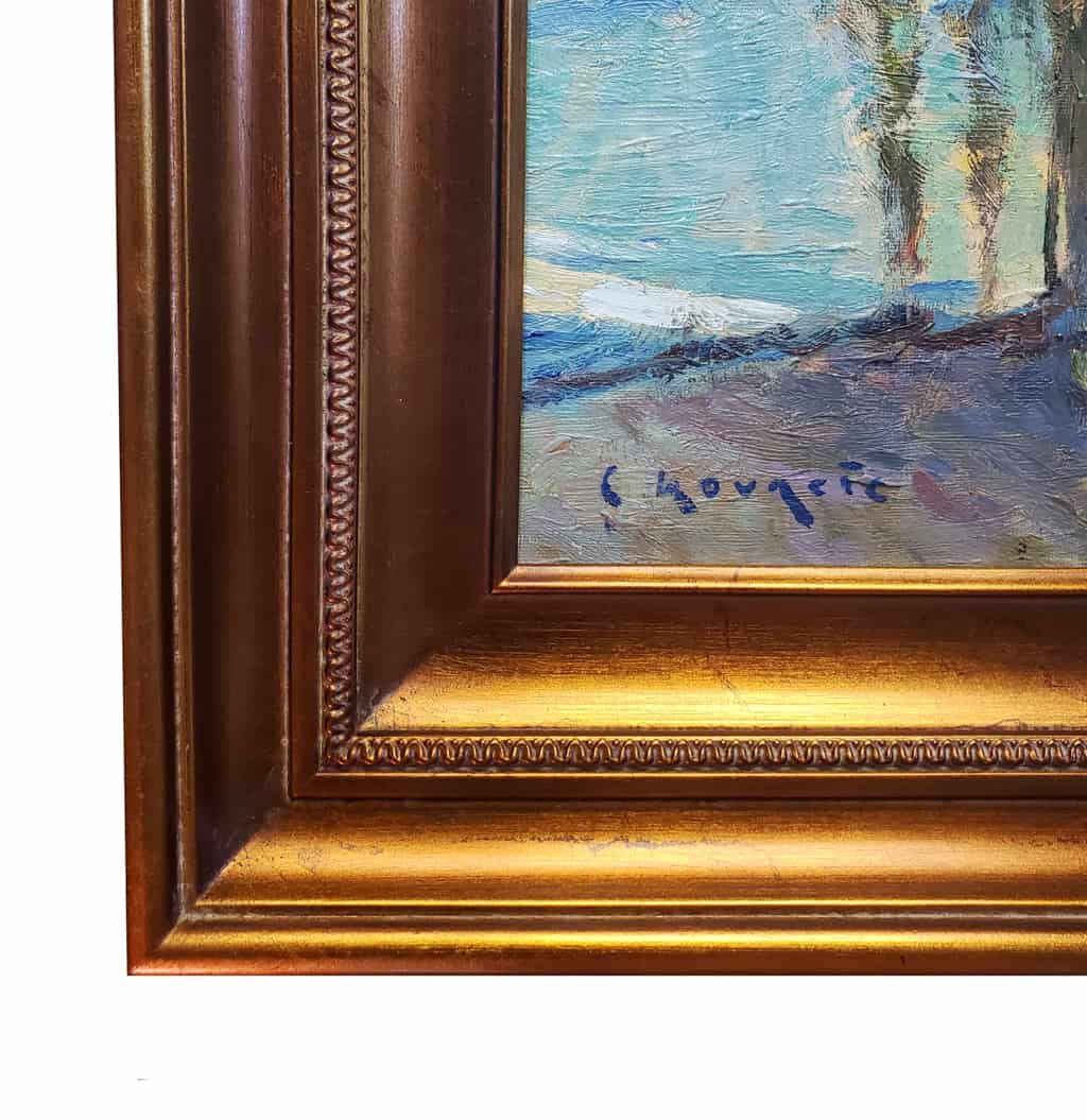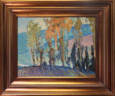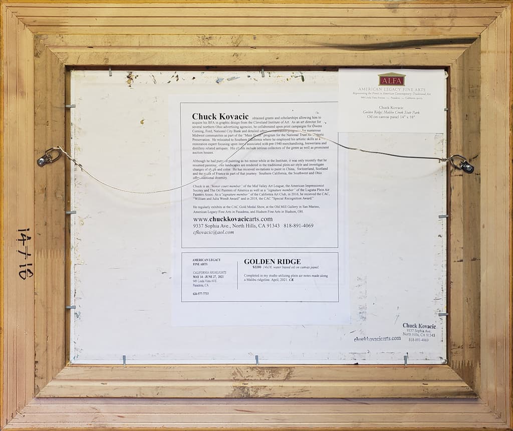 This painting was completed in the artist’s studio in North Hills, California from plein air field notes. Framed in copper-colored metallic finish on wood frame.