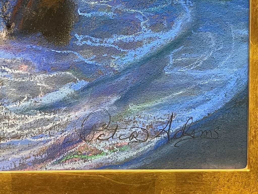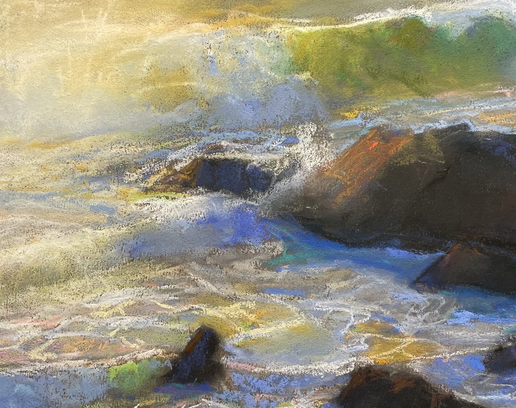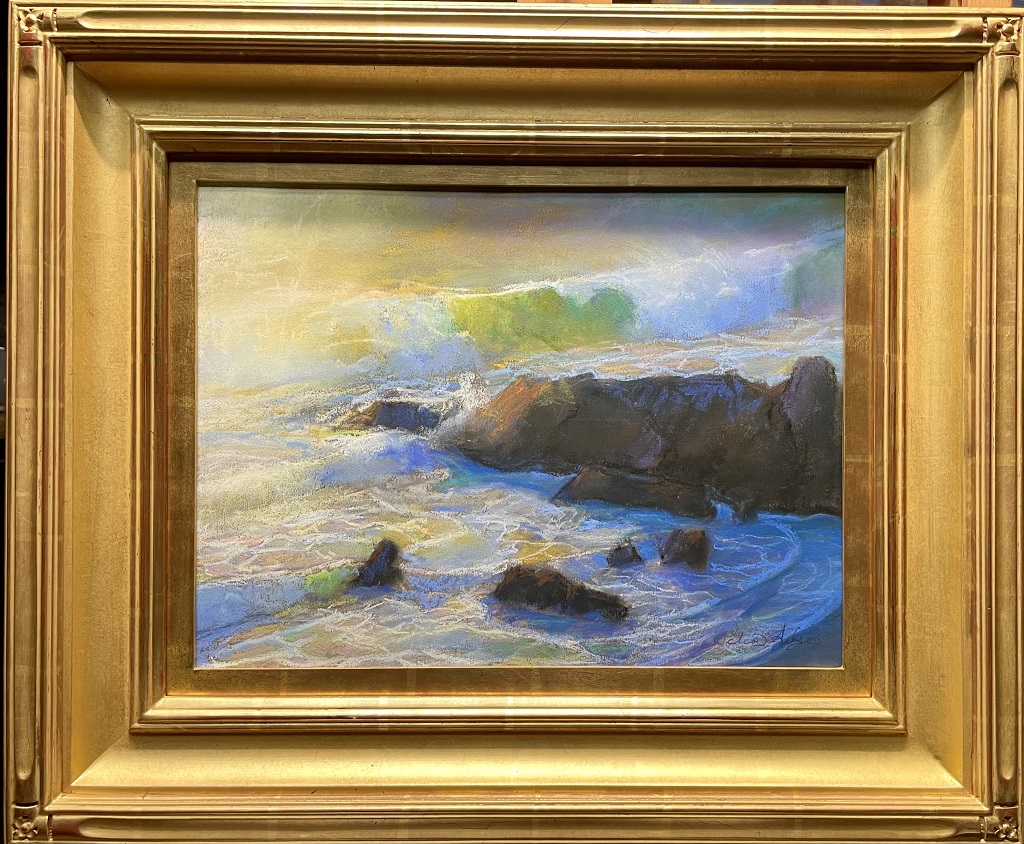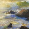 “I loved painting this on location as the bright afternoon glare stimulated my sense of creativity. I enjoyed the fact that the crashing wave on the left-hand side dissolved into pure light and added a dimension of mystery to the work.”