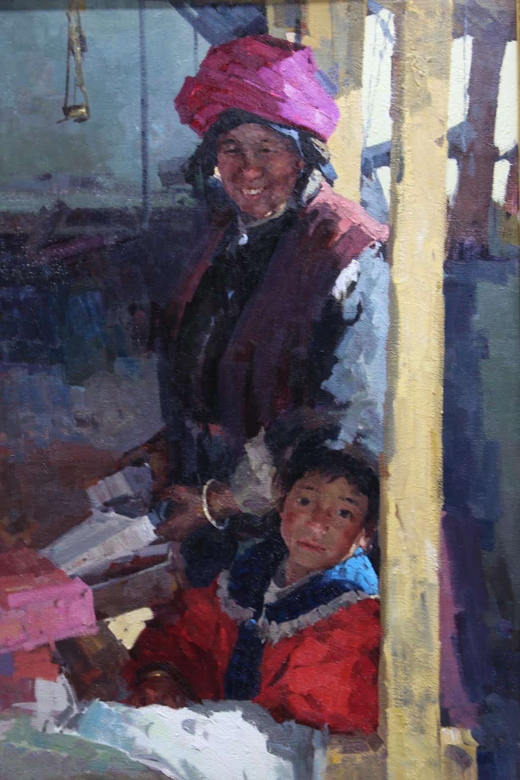 Jove Wang depicts an everyday genre from the Yunnan province of the People's Republic of China in Shangri-La City. In this traditional scene, the viewer experiences family relationships within the culture. Here, a young girl and her grandmother have stopped to rest from shopping in the marketplace, while the grandmother happily opens a box of sweets to please her grandchild.