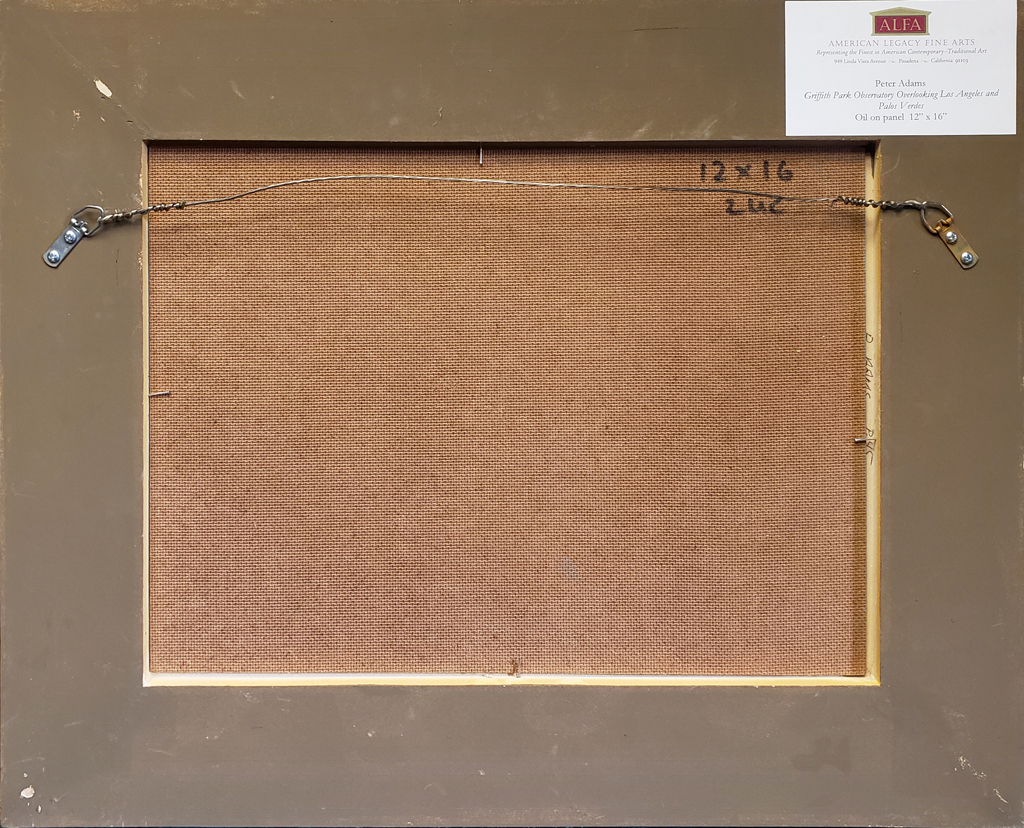 Peter Adams Available Work Archives Biography Press and Publications Commissions Art Reviews Studio Visit View in Room Sizing is approximate. See specs for exact dimensions. Twitter Email Peter AdamsGriffith Park Observatory Overlooking Los Angeles, Palos Verdes and CatalinaOil on panel12" x 16", artwork18.5" x 24.5", framedContemporaryNot AvailableOut of stock Request More Information Provenance Acquired by American Legacy Fine Arts directly from the artist Exhibited Spring into Art 2022, presented by the San Marino League at The Huntington Library, San Marino, California, March 25 - March 27, 2022 Need help? Call our ALFA specialists +1 626.577.7733 Available Artwork by Peter Adams