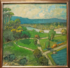 "The angular shapes the dirt roads make, the percolating pools, the grasses and the river heading for the Arroyo bridge on its way to the ocean. The frame is done in white gold and was hand made by me."