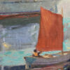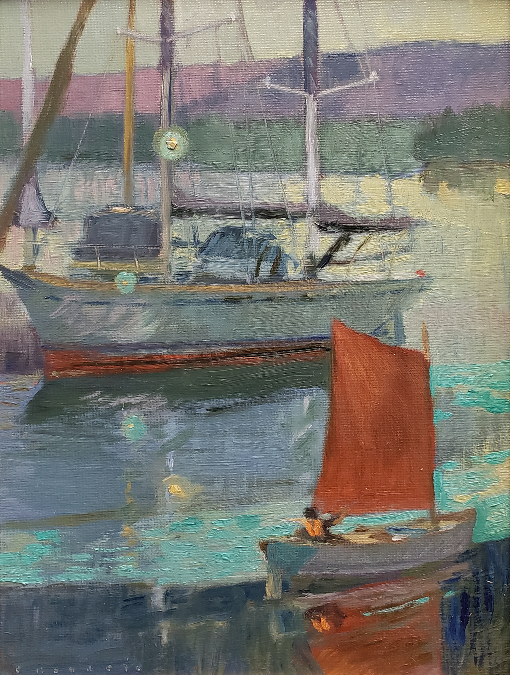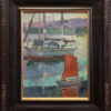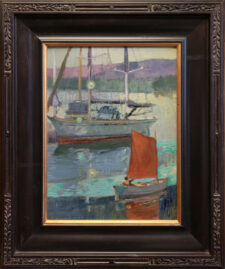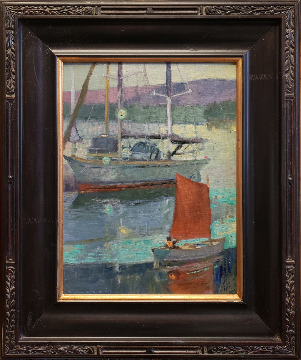 “An early August morning. A heavy marine layer has enveloped Alameda Island. Harry Wilcox, sailing instructor at the Alameda Yacht Club, glides across the waters before his first instructional of the day. Two hours later, prompted by clearing skies, his awaiting students are at the ready. A studio rendering based upon plein air notes.”