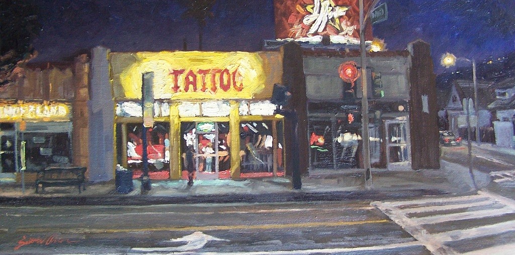 The reputation of High Voltage Tattoo Shop is among the most famous in the world. The owner, entrepreneur, and pop icon, tattoo artist Kat Von D (born Katherine von Drachenberg) helped popularize the art of body tattoos by starring in her own successful reality TV series called "LA Ink" for TLC. Located on North La Brea Avenue in West Hollywood, High Voltage shop is part of LA's contemporary urban culture and is frequented by Hollywood entertainers and creative types, including recognizable film and TV celebrities and rock stars. In this painting, Scott W. Prior emphasizes the electric energy that exudes from High Voltage during late hours by painting lively strokes in yellows and reds as contrasted against a still, deep-blue nighttime sky.