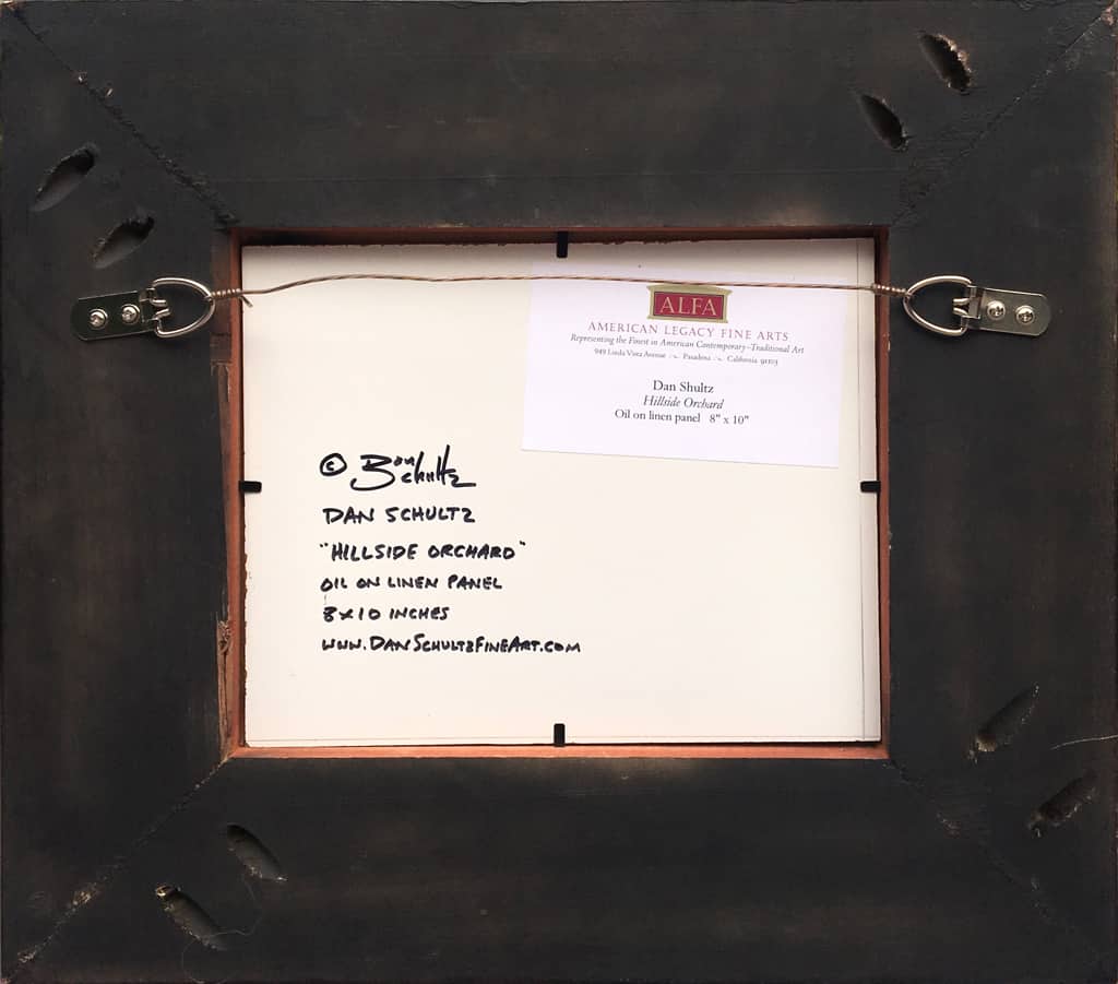 Dan Schultz Available Work Archives Biography Press and Publications View in Room Sizing is approximate. See specs for exact dimensions. Twitter Email Dan SchultzHillside OrchardOil on linen panel8" x 10", artwork15" x 17" x 1.75", framedContemporaryNot AvailableOut of stock Request More Information Provenance Acquired by American Legacy Fine Arts directly from the artist Description Painted on location on a quiet, secluded back road in the Ojai Valley. Exhibited "Fleeting Moments: Works en Plein Air" at American Legacy Fine Arts, Pasadena , California, November 17 - December 15, 2017 Need help? Call our ALFA specialists +1 626.577.7733 Available Artwork by Dan Schultz