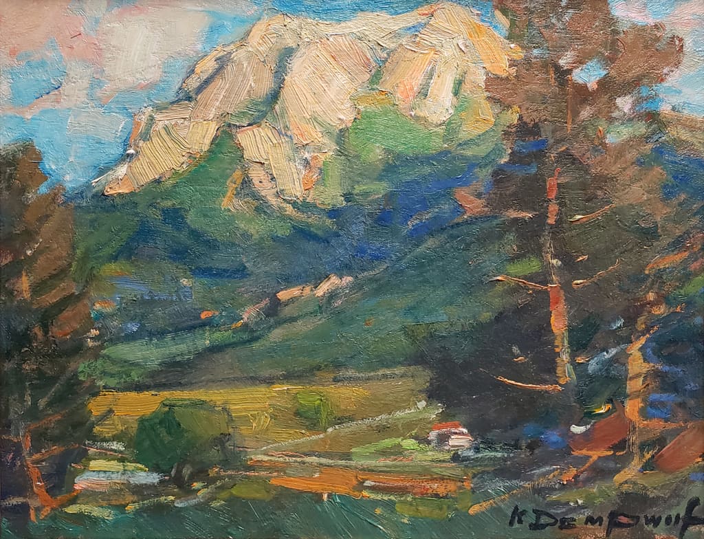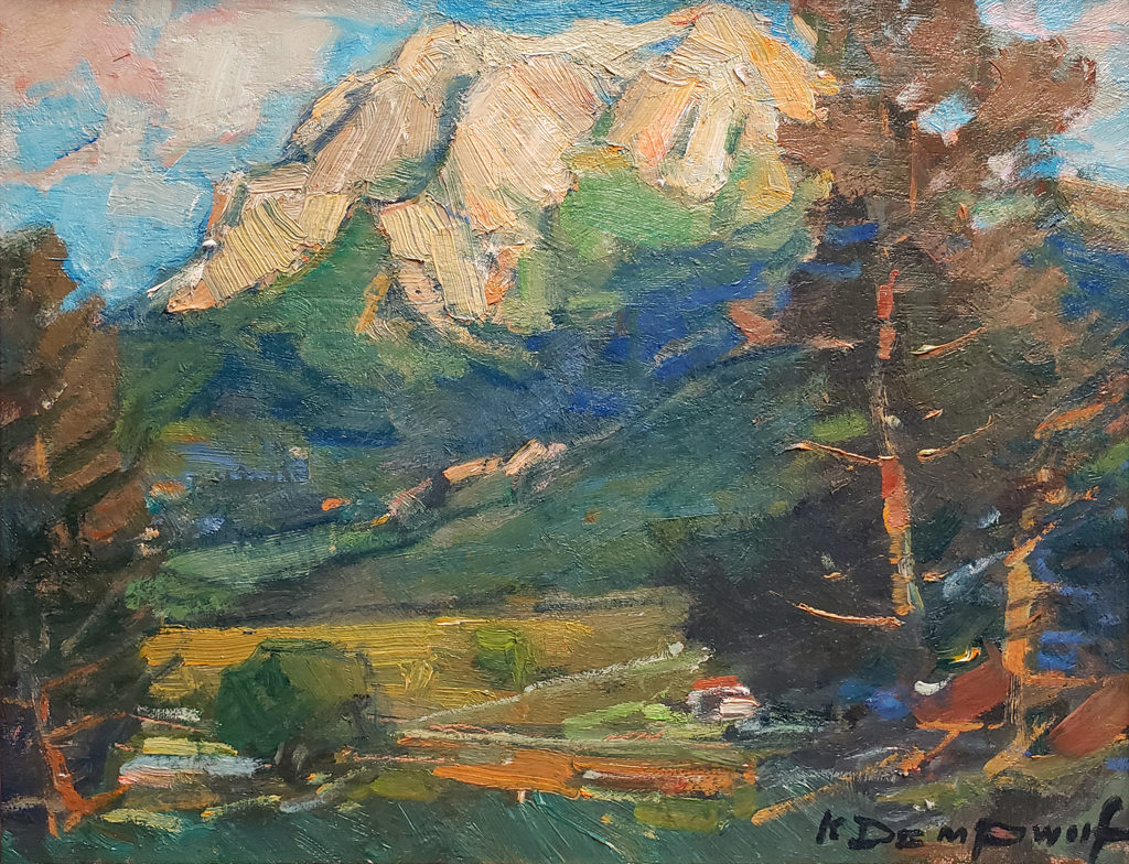"When leaving Morro Bay and heading south towards San Luis Obispo a massive volcanic core looms just west of the Pacific Coast Hwy to the right of the highway in front of you, this is Hollister Peak. William Wendt paid tribute to it in his masterpiece, very large and beautiful painting "Where Nature's God Hath Wrought". This area was a very active volcanic region many millions of years ago, with seven visible volcanic peaks called the Seven Sisters visible today, which includes both Hollister Peak and Morro Rock. I have tried to paint Hollister Peak in the past, but nothing I liked came of it. This painting with the evening light on the both the hills and pines framing the subject, I feel will be made into an enlargement to develop the various shapes and masses".