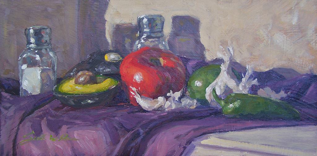 The ingredients needed for a guacamole recipe became a playful subject for Scott Prior’s painting. The folds in the tablecloth and the way in which the light hits the bell peppers showcase the effects of a still-life, done in the plein air tradition.