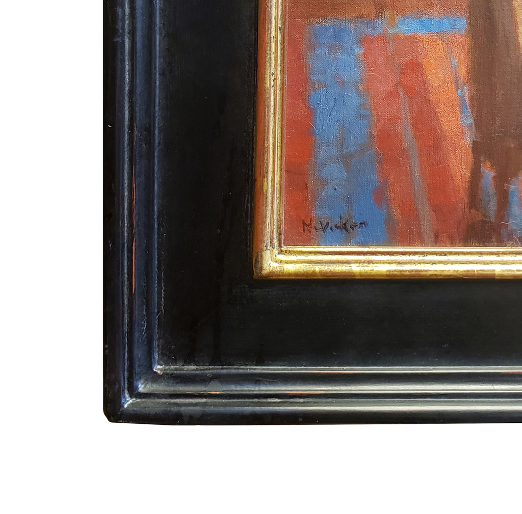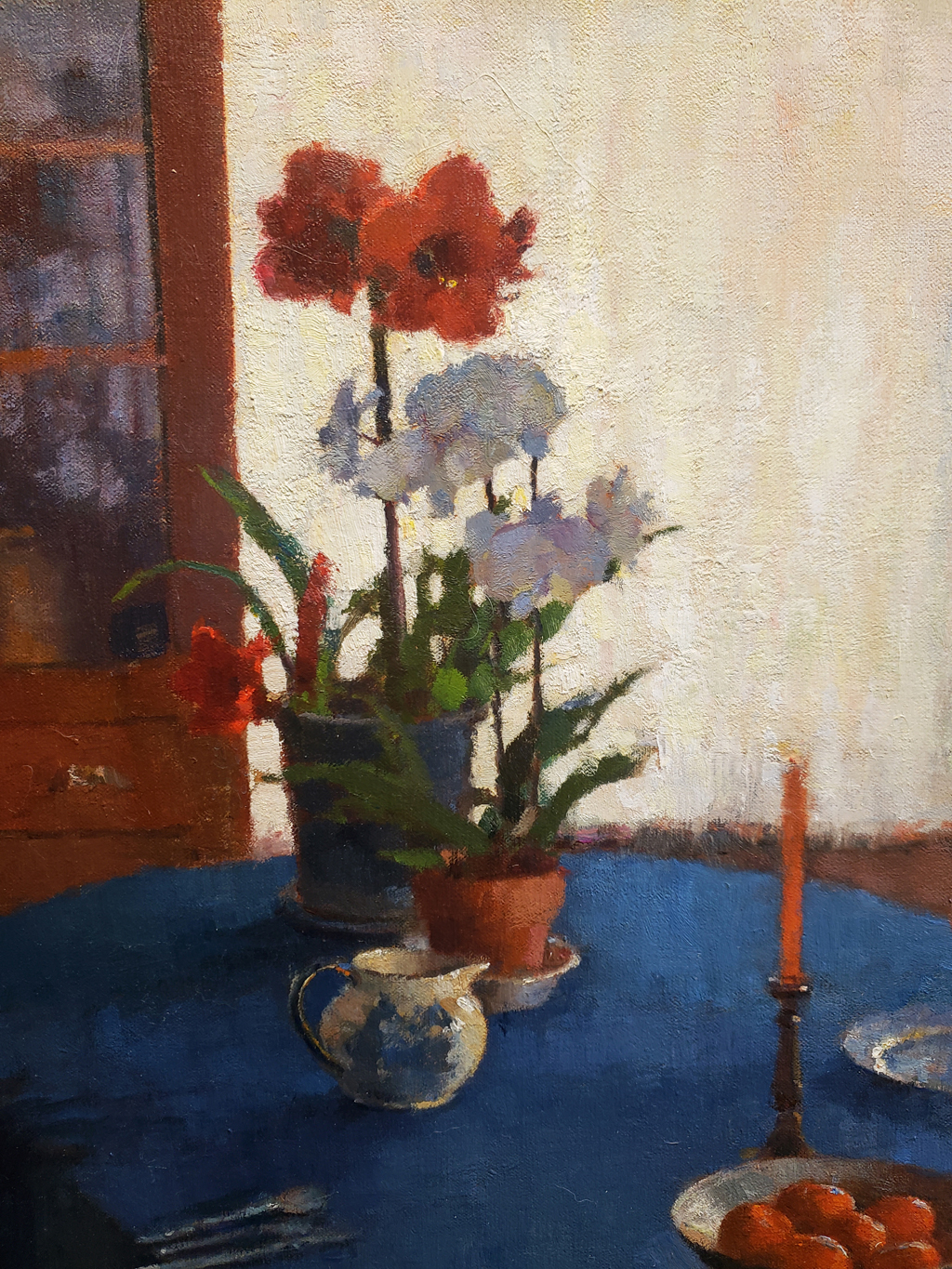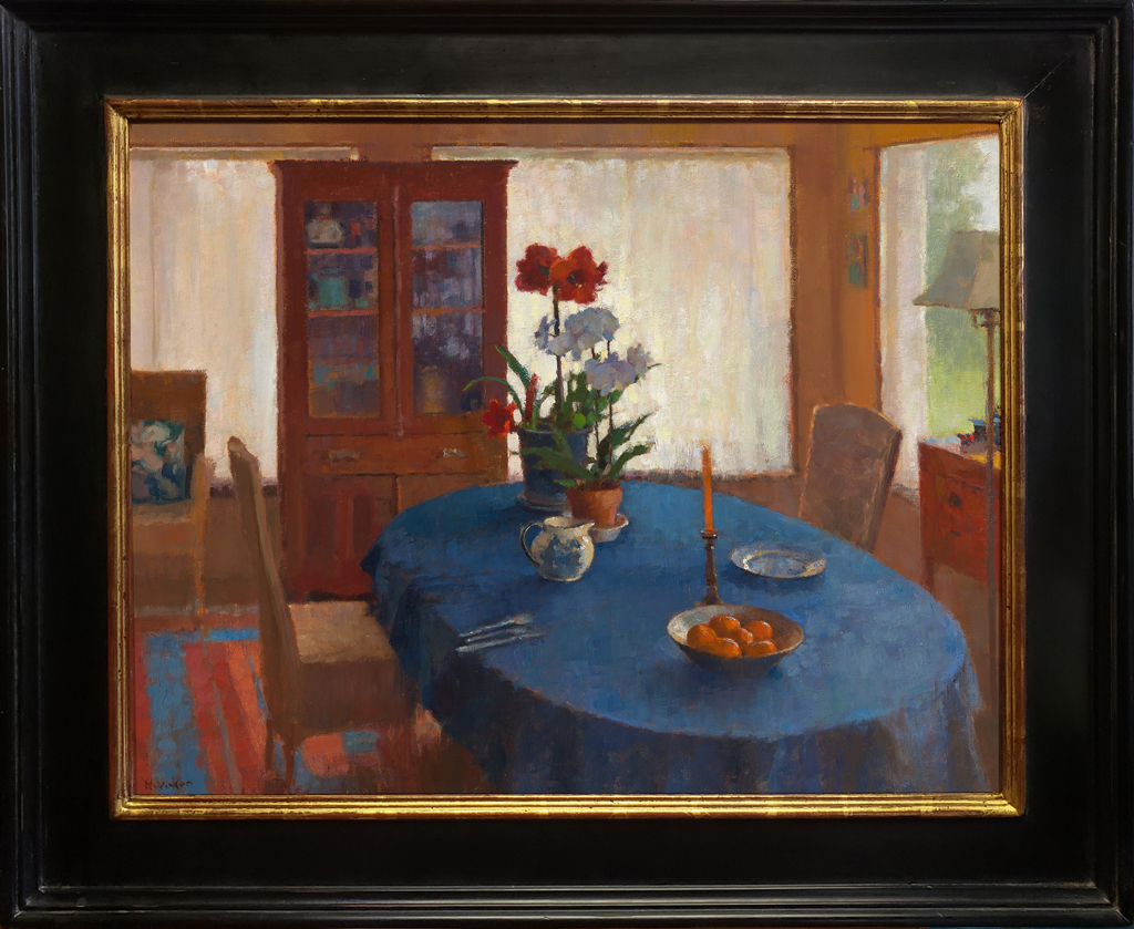 “This was painted in our kitchen looking into the dining room. It was created from life over several sessions. Then, the painting lived with me for a long time until I decided to get back into it in my studio. I worked on the scene from memory and painted what I felt the work needed.”