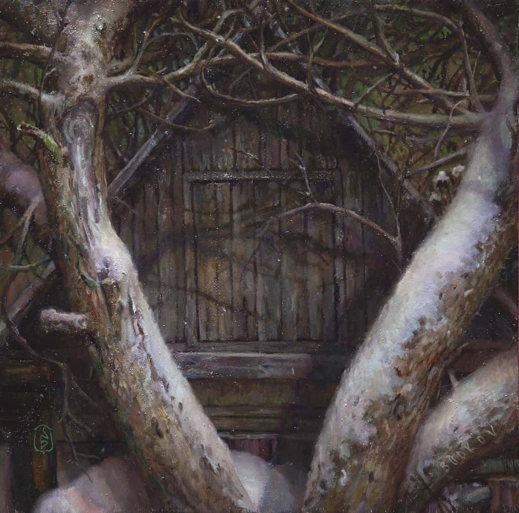 "That night there was a heavy snowstorm. The obscure silhouette of the cabin resembled an ancient chapel with tree trunks as colossal cloaking arms. As I painted in the cold waning moonlight the scene gave forth to something primordial, cosmic, and unknown. The heavy snowfall was everywhere on my palette and panel, I could not help but mix it with the oil paint—an alchemic improvisation born of that fleeting moment. I moved rapidly to finish the first layer before the cold overtook me. I left feeling strangely initiated in the riddles of the night."