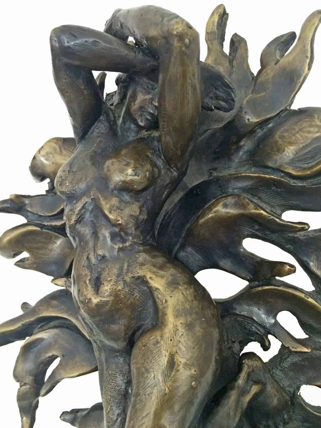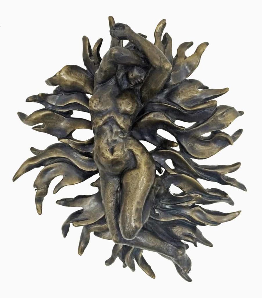 Christopher Slatoff’s Judgment of Wotan; Die Walkure II depicts the music drama, Walkure, Die (The Valkyrie). The "Judgment of Wotan" refers to the wrath of the ruler of heaven and earth. This sculpture's ring of fire and the female subject's body language suggest a state of panic and chaos.