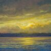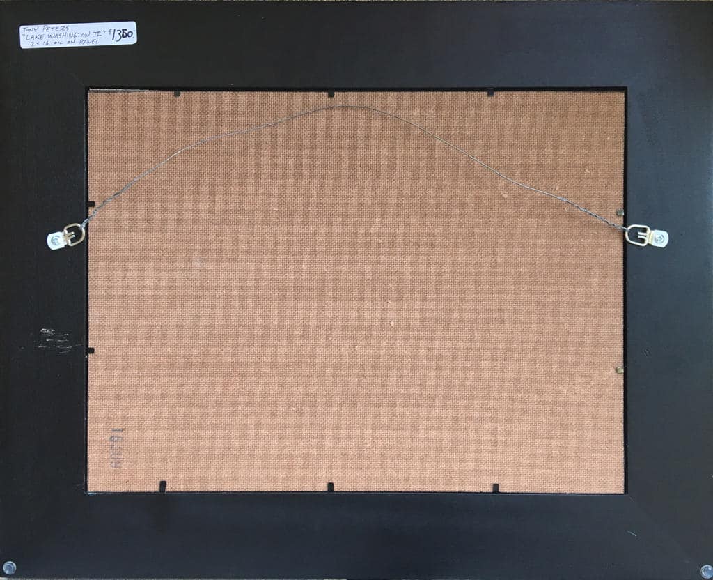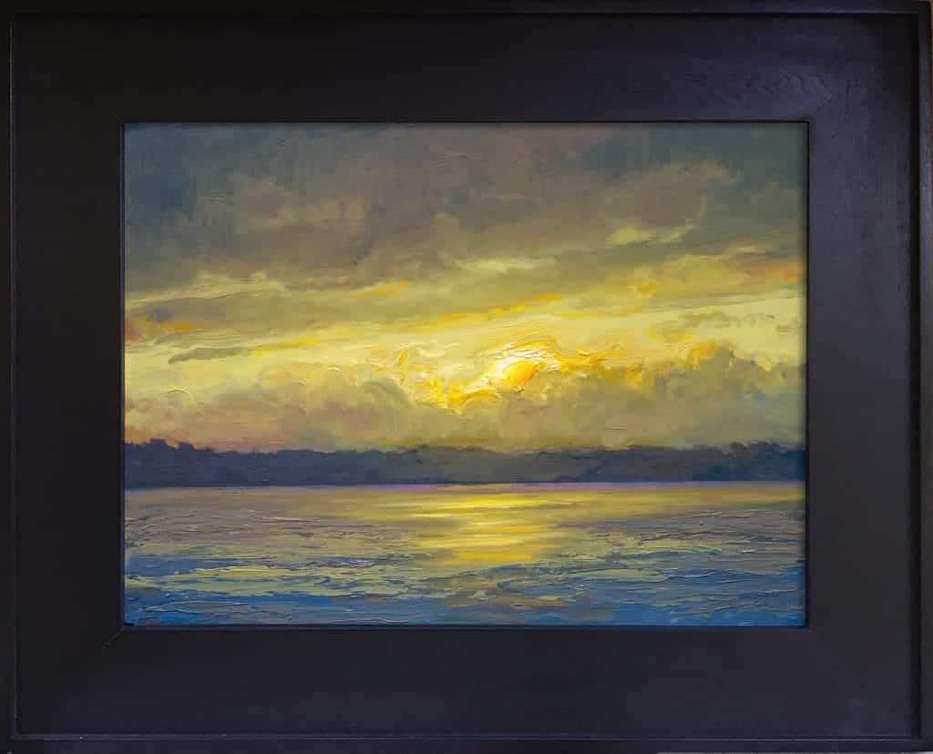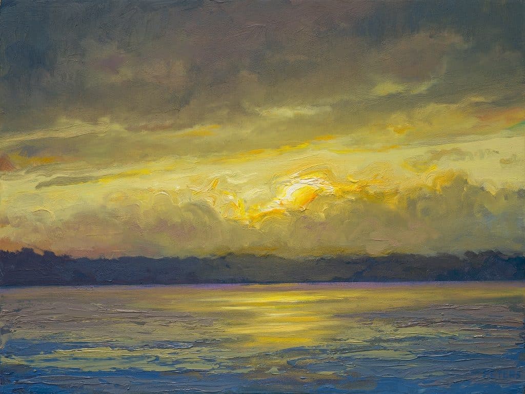 “Both paintings, Lake Washington II and Lake Washington III, were part of a group of plein air studies that I painted in a park looking west toward Lake Washington at varying times of the day. My intent with the series was to create a work routine, as I had just moved to the Seattle area and needed to get out and paint regularly. I wanted to go outside to work before the rainy season started, study the drifting clouds in the sky, and work quickly (in contrast to my studio work). I found that painting clouds was not exactly like other kinds of observational painting, and instead of documenting the landscape I began creating a type of fiction inspired by what I saw. But, the clouds changed so fast that I invented something more to my imagination or how I felt.”
