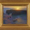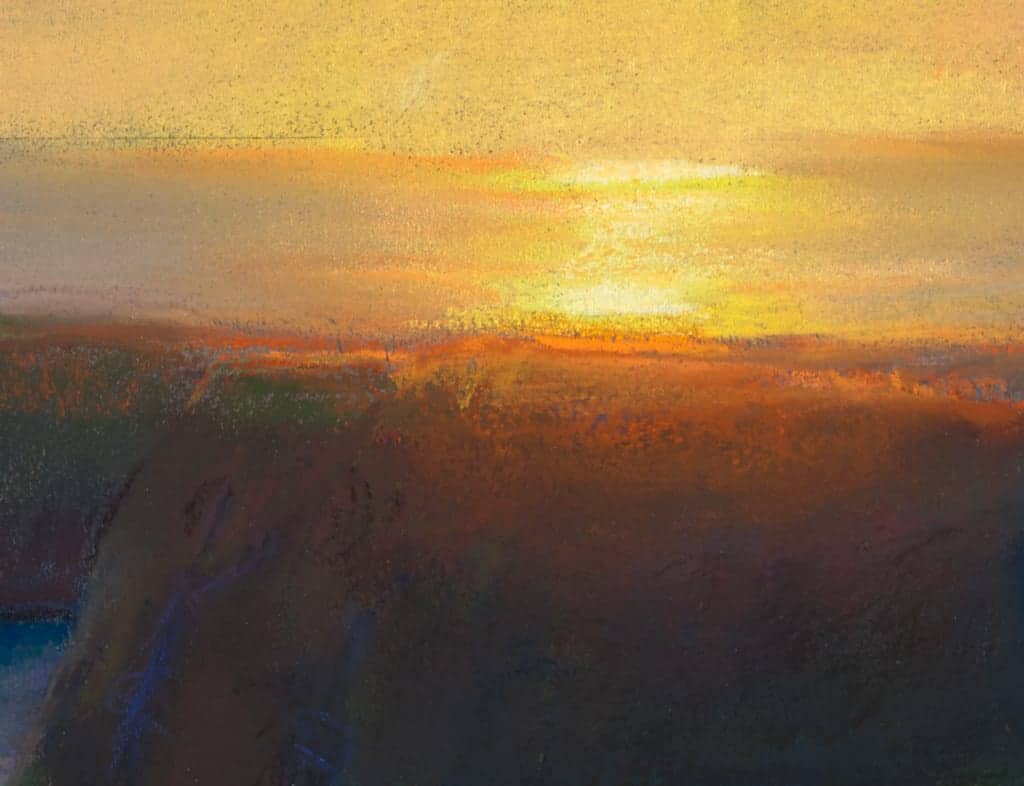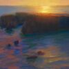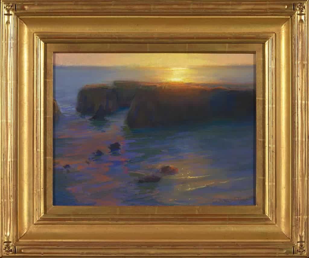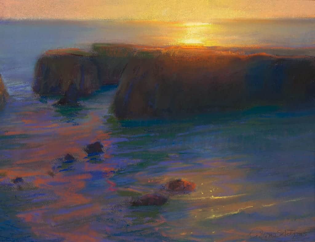 "This plein air pastel was created on a recent painting trip to Northern California. When I work in pastel, I typically sit in a camping chair or on the ground with my five dogs at my feet. I was particularly excited by the Mendocino Headlands because the water on both sides of the rock formations do different things at the same time. Here in this painting, on the ocean side the water glistens in intense sunlight; while on the leeward side the water is in shadow with just a faint hint of glimmer. I wanted to capture this moment when the sun’s forceful glare tapers down and eventually becomes an echo of itself."