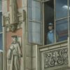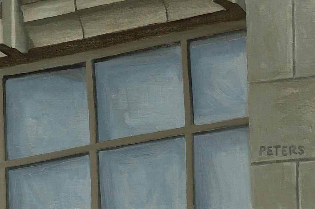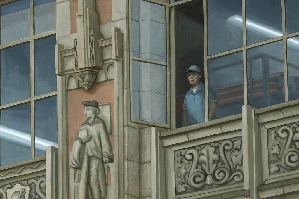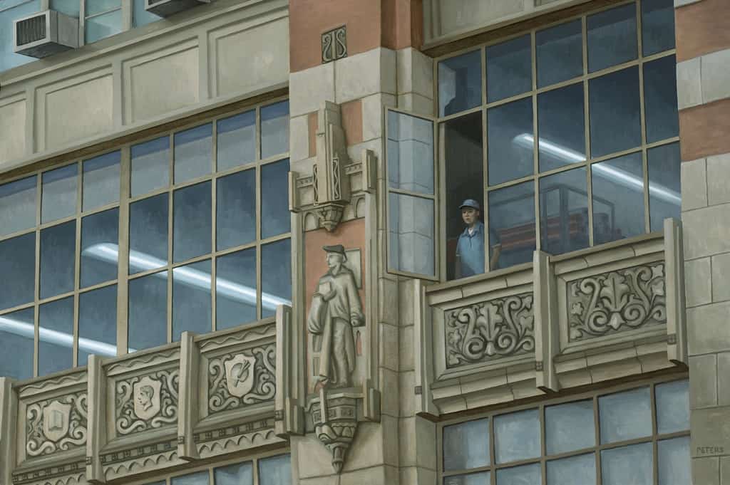 Description Looking Outward, Downtown Fashion District depicts the triumphs and tribulations of the pursuit of happiness in the urban landscape. The title, “looking outward”, refers to a state of dreaming and longing. The painting features a blue-collar worker gazing outside the factory window, longing for a different present. Peters’ artwork invokes a sense of alienation and isolation in the contemporary metropolis.