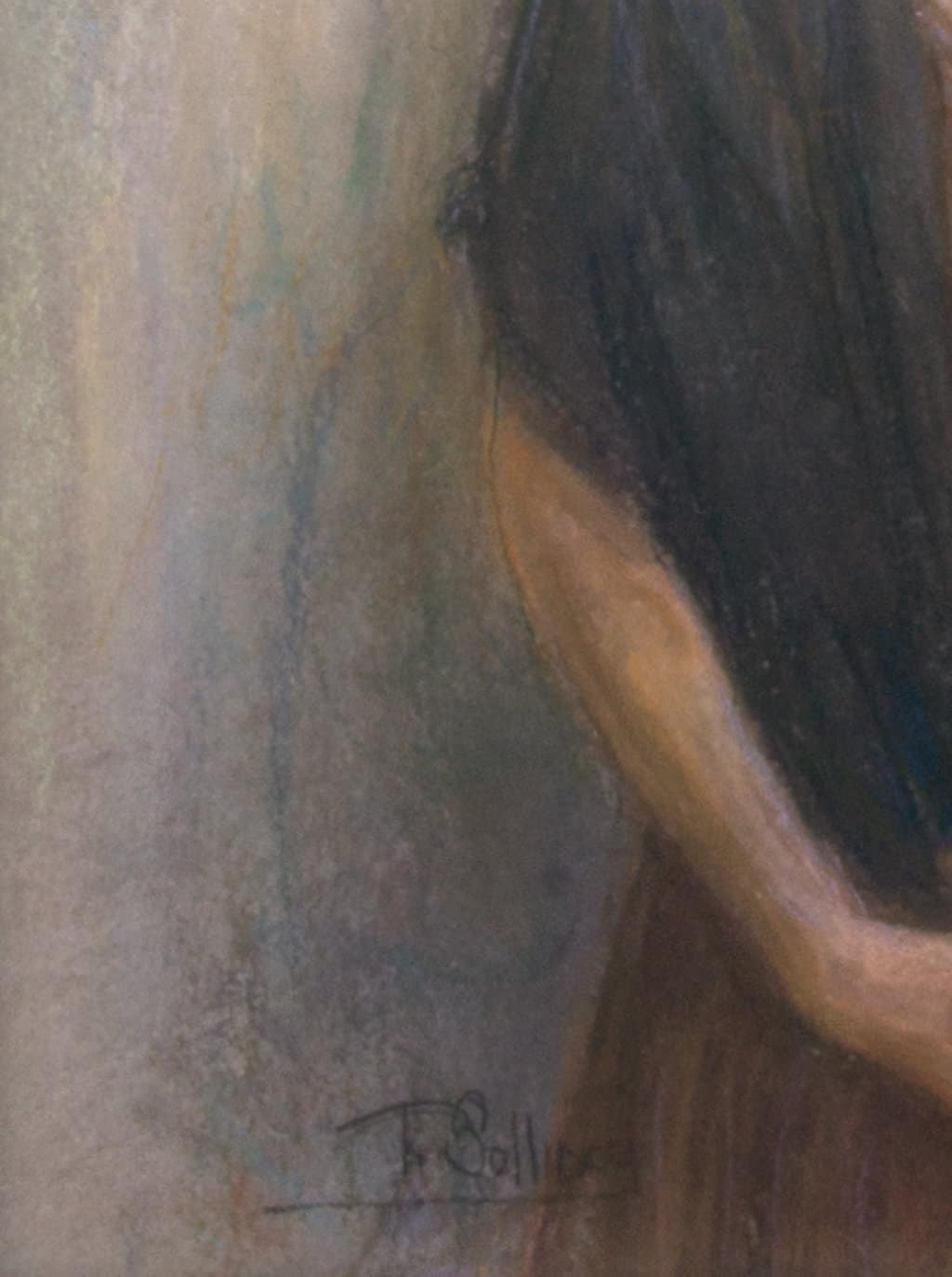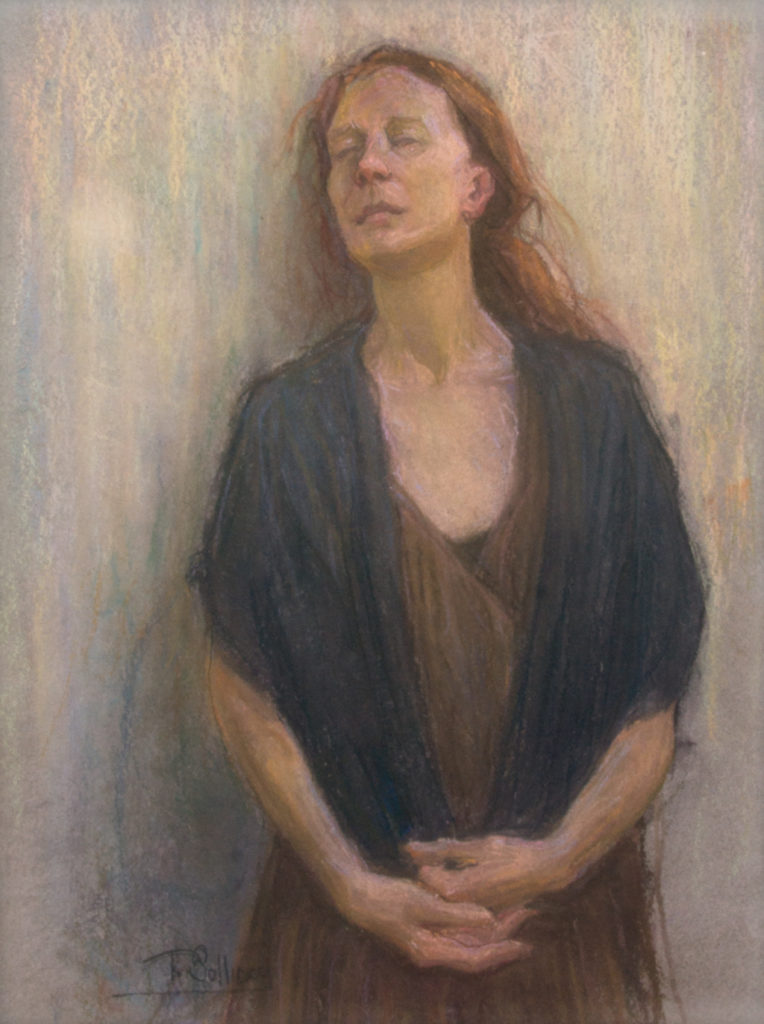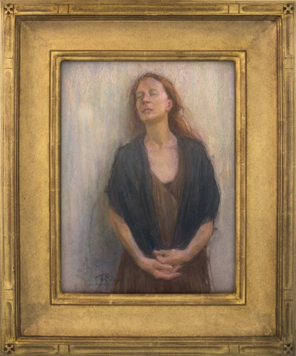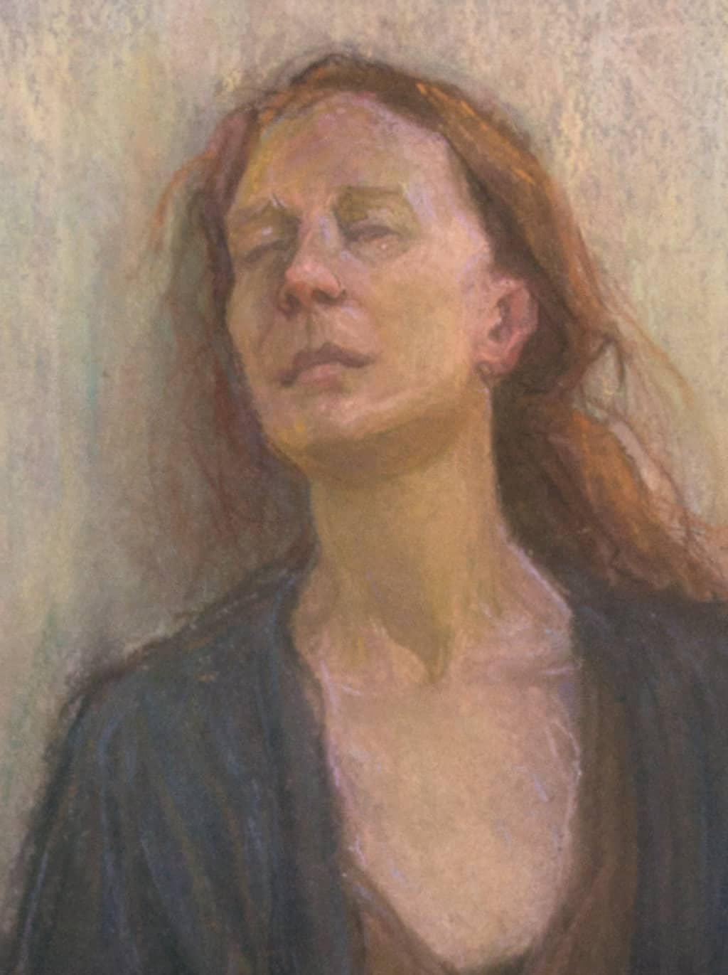 Tim Solliday created this beautiful contemplative pastel painting while studying anatomy with Steve Houston. One day when in class, Houston’s students received a task of doing a study of the female face features, skin and hair. The red-haired model, who posed for students that day, in Solliday’s opinion was a plain girl but there was an unexplainable attraction to her.