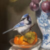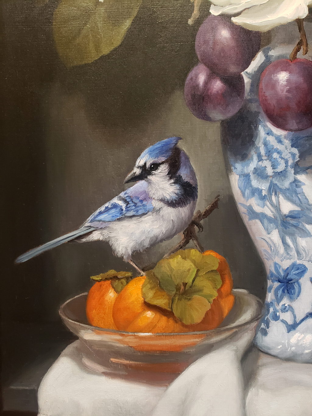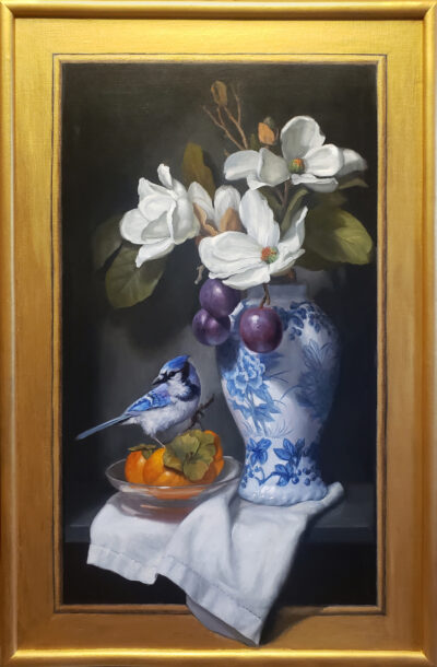 “The magnolia tree and I share common rots in the Southeast. The Carolinas, Georgia, and Tennessee are home to us both. This stately, ancient tree is native to the Southeast. Its large fragrant blossoms and dark, shiny leaves adorn the green lawns and line the streets of the small towns where I am from. So, when I moved to California, I was pleasantly surprised to see this icon from the South growing freely here as well! This paining, with its representatives from the Southeast (the Magnolia and Blue Jay) and the West (the Plums and Persimmons) shows how roots can expand and grow to embrace new beginnings.”