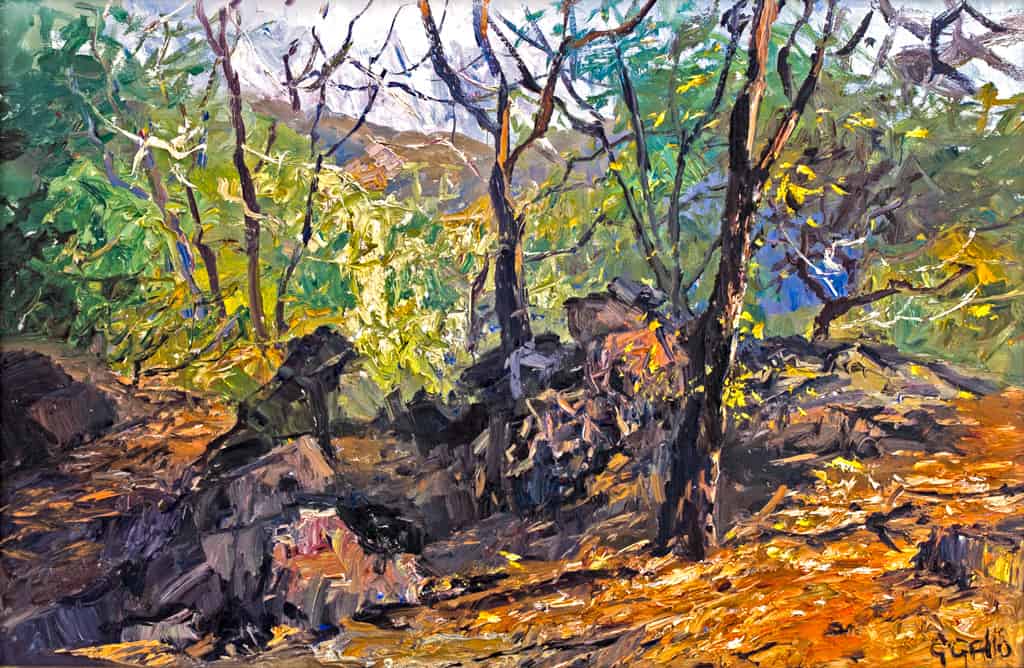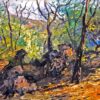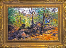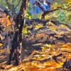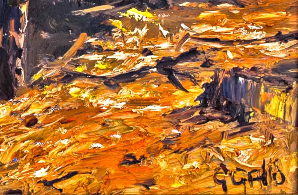 George Gallo’s Malibu State Park, Late Afternoon illustrates the time of day in which the sun glows above the trees. This painting, done in the post-impressionistic style, showcases delineated features of nature. The jagged brushstrokes reflect an authentic feel of nature. The overlapping colors create warm, intense hues found in nature.