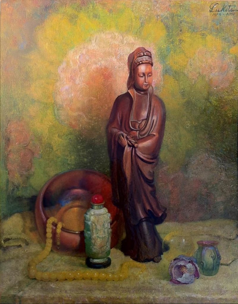 Theodore Nikolai Lukits collected Asian art objects, which he incorporated into his painting compositions. In "Meditation," created circa 1944, the central figure of a wood-carved Buddha is surrounded by exotic novelties -- jade carved snuff bottle, yellow-amber bead necklace -- and set against an elaborate wallpaper of pink peonies.