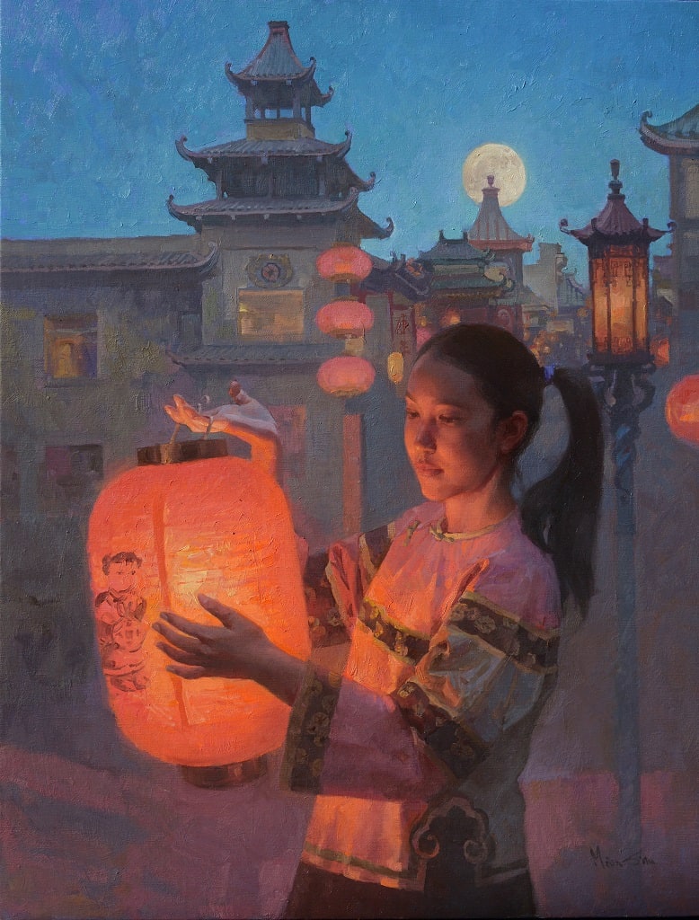 Imbued with soft light from the lantern and full moon, this nocturne oil painting by Mian Situ shows the artist’s masterful ability to bring a moment in time to life. The Autumn Moon Festival has been held annually in San Francisco’s Chinatown district since 1991 to celebrate the Mid-Autumn Festival, also known as the Moon Festival, approximately six months after the New Year parade, and is hosted by the Chinatown Merchants Association of San Francisco. The young girl in the scene is contemporary, however, she is wearing a traditional silk embroidered tunic from the Qing Dynasty, the last imperial dynasty that ruled China from 1644 to 1911. With this painting, the artist pays homage to China’s Imperial history as a connection to the Chinese people’s rich culture.