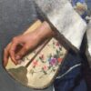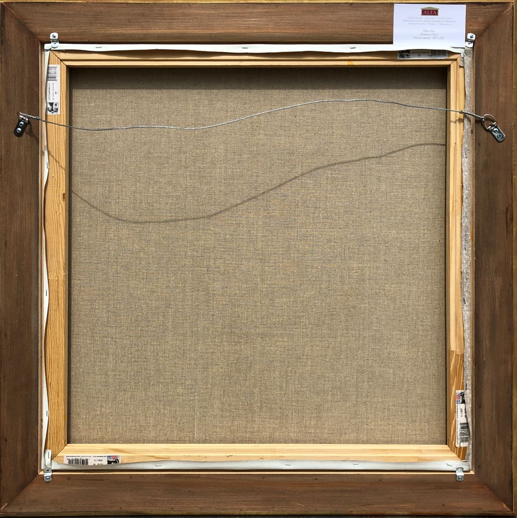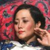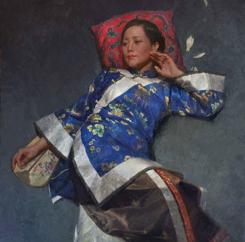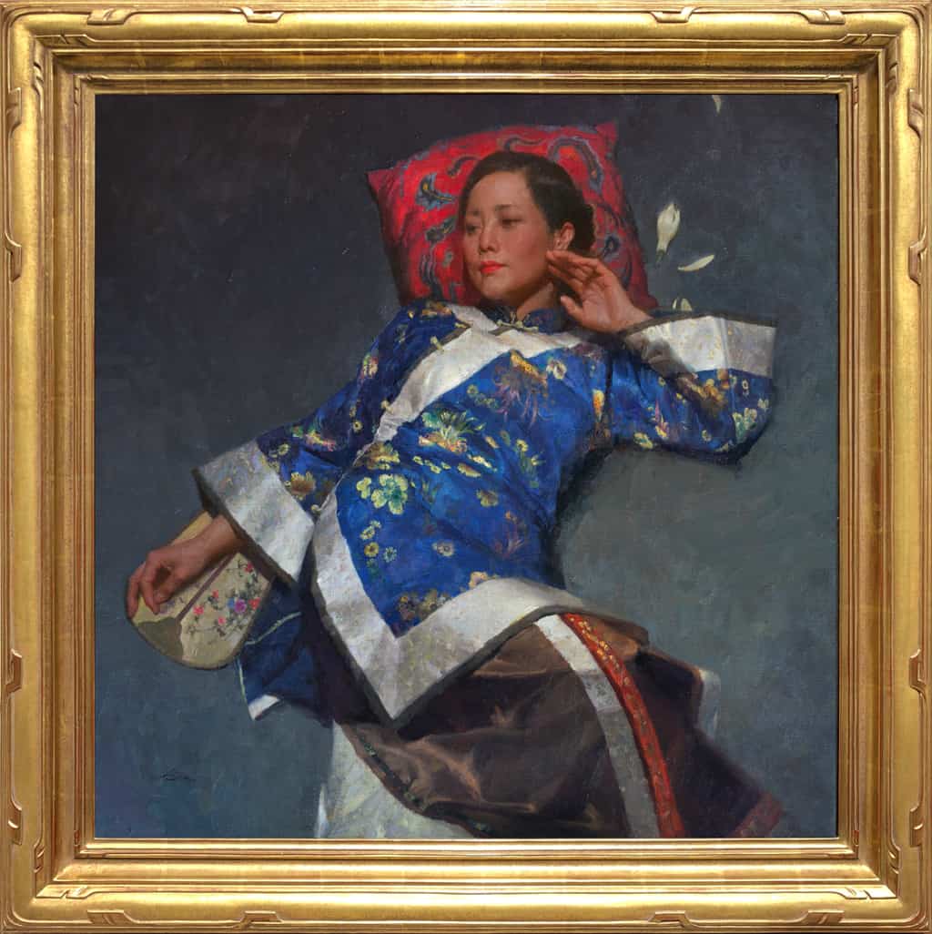 The painting depicts the artist's wife Gloria in dreamy repose and dressed in traditional Chinese embroidered silks. Mian Situ chose an elevated perspective to express a tranquil sinuous form. The three-dimensional composition was taken from the vantage point on top a ladder. Using the foreshortening method, Situ renders her left hand to seemingly move towards the viewer as it gently brushes against her face and invites us into her tranquil “Moment of Peace.”