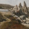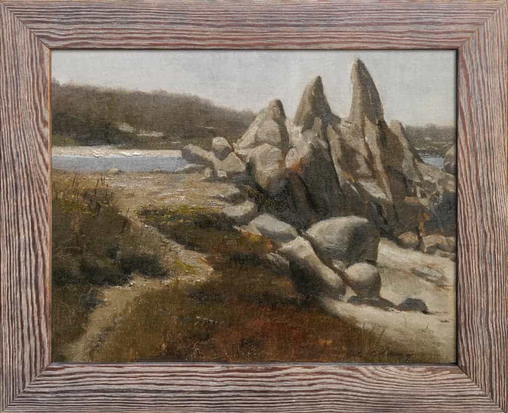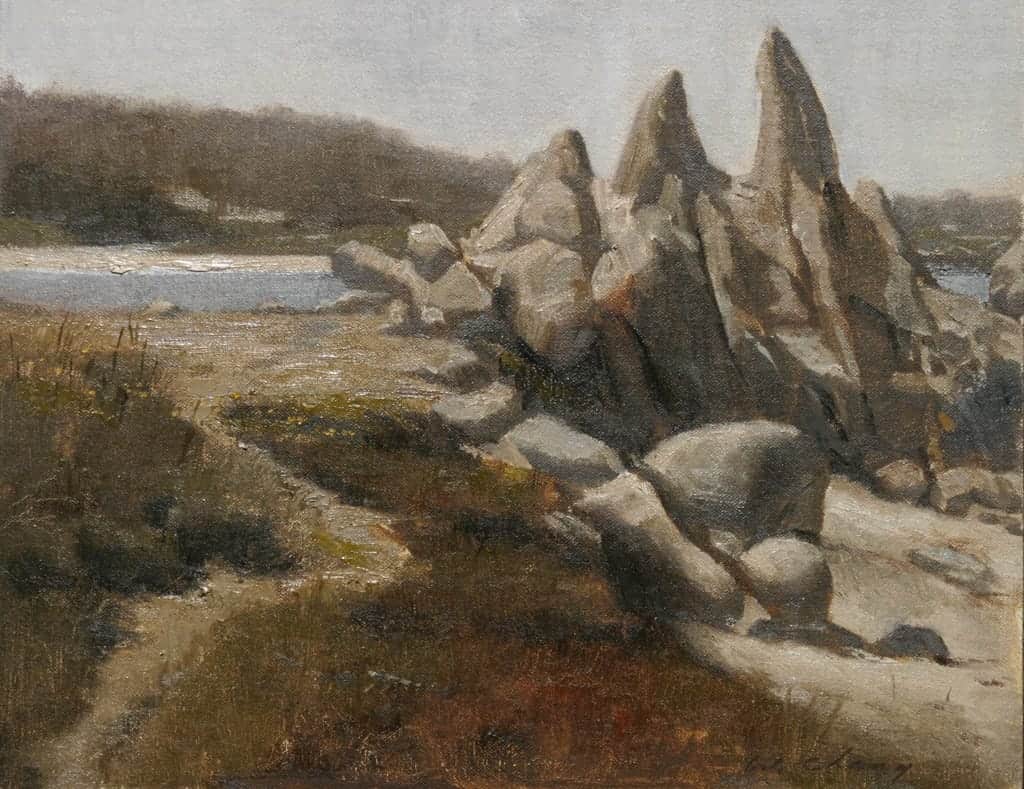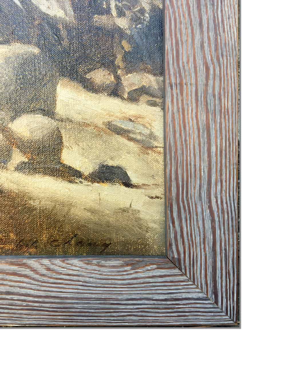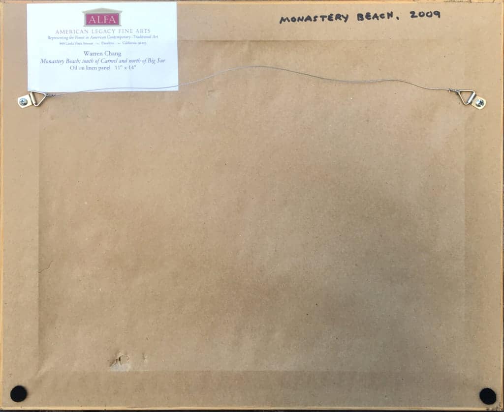 Painted en plein air at Monastery Beach, just south of Carmel and north of Big Sur, Monastery Beach is named for the Carmelite Monastery Mission across Highway 1. This beautiful sandy cove appears serene, but, it is also considered one of the most dangerous beaches in California due to strong rip currents. The surrounding outcropping of rocky spires are characteristic of the area and enhance the precarious mood of the scene.