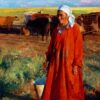 "In the early 90s, I traveled to Mongolia to photograph scenes of Mongolian women milking their cows for my paintings. In the prairie of Chinese Mongolia, there is a family that lives on raising and milking their cows. One morning, I saw a woman having just finished milking a cow with the sunrise behind her. She was wearing a red gown and the color contrasted with the dark cow in the background. It was so beautiful and gave me a huge burst of inspiration, which lead me to create this meaningful piece." - Jove Wang