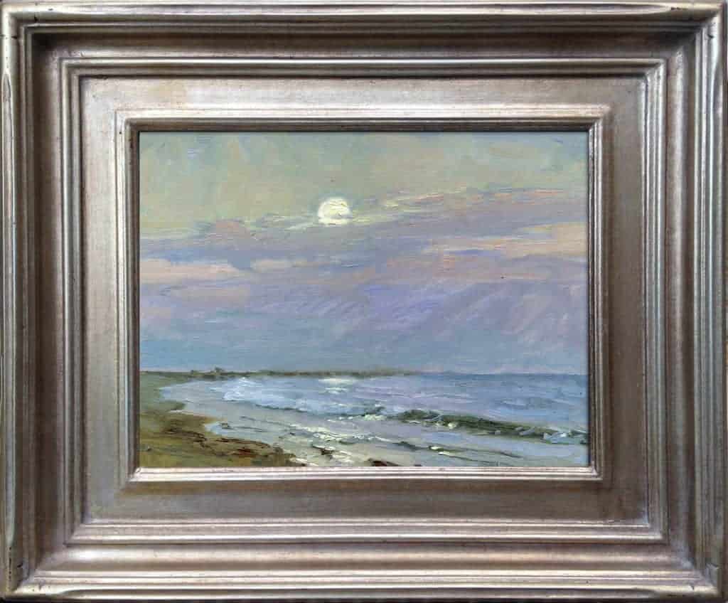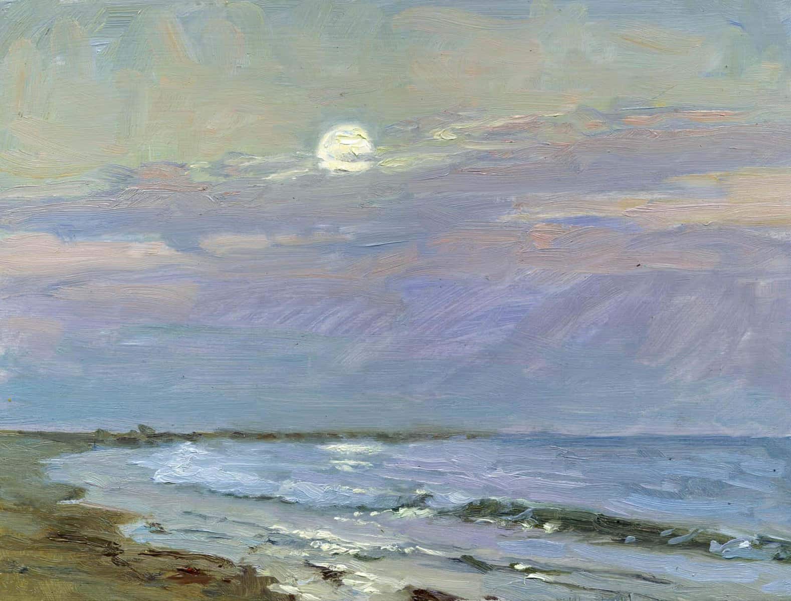 "Painting the moonrise along the coast is always a gamble. You never know what you’re going to get. You set up to paint and wait. Will there be a few clouds to make the moonrise interesting or will clouds race in and completely obscure the moon? Then there’s that rare beautiful moment when the magic happens."