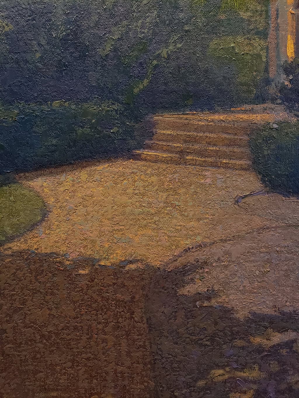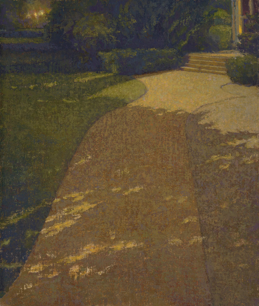 Description Dappled shadows of a large tree are projected by moonlight onto a broad walkway. With only segments of visible information, Jennifer Moses manages to lead the viewer into both a real and subconscious experience. The paint surface has a generous dry oil impasto texture, making the scene appear satisfyingly tactile.