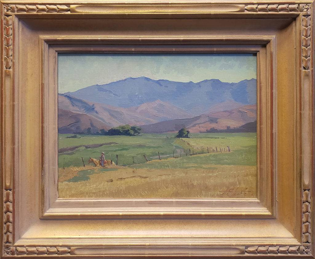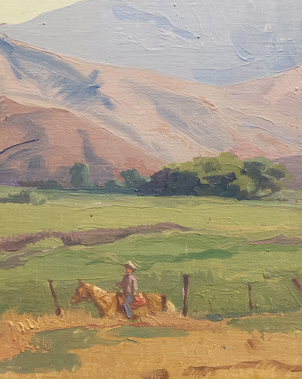 “In this painting I was fascinated by the expansive green valley at the foothills of surrounding mountains, and the sense of distance it created and perfectly accentuated its magnificent colors. I also love the completely authentic feel of this remarkable California ranch which continues to preserve the ethos and culture of a working ranch out west.”