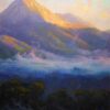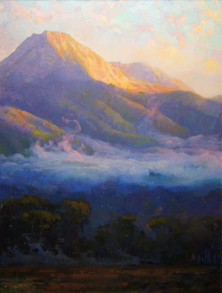 Description The artist's particular bold, broad brushwork magnifies a sense of epic in this pristine scene. The painting exemplifies the American West as an expansive land of free spirit and boundless possibilities. The colors are opulent and there is an intriguing sense of mystery about the subject, a Shangri-la feeling. The presentation of the painting makes a grand entrance statement.