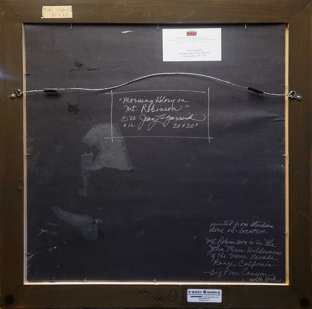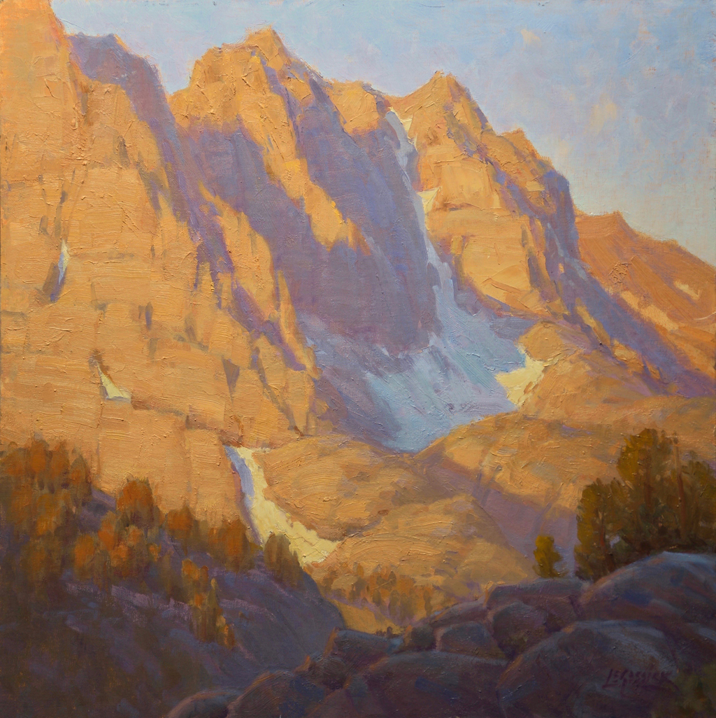 “The Sierra Nevada is my favorite mountain range. Over the years, I have taken many mule pack trips to the area to spend time painting there. In order to capture the first warm light on Mt. Robinson, I had to get up very early—and then, paint very fast! From my initial small plein air study, I developed this piece.”