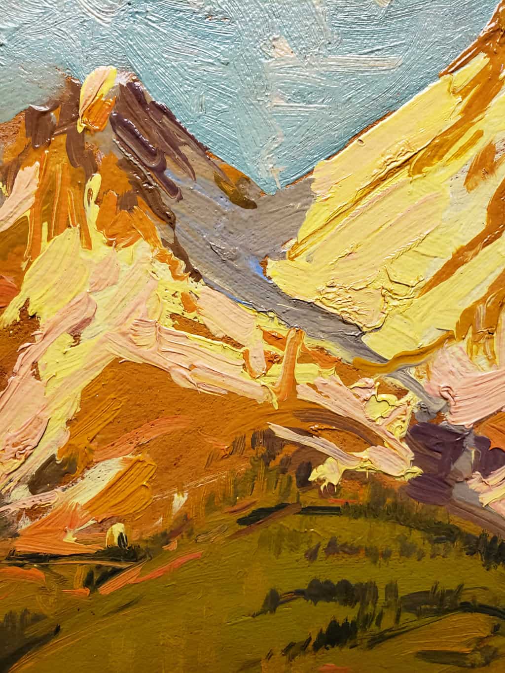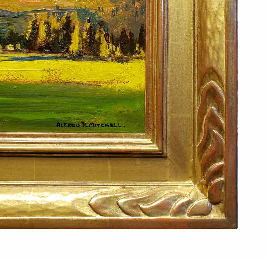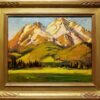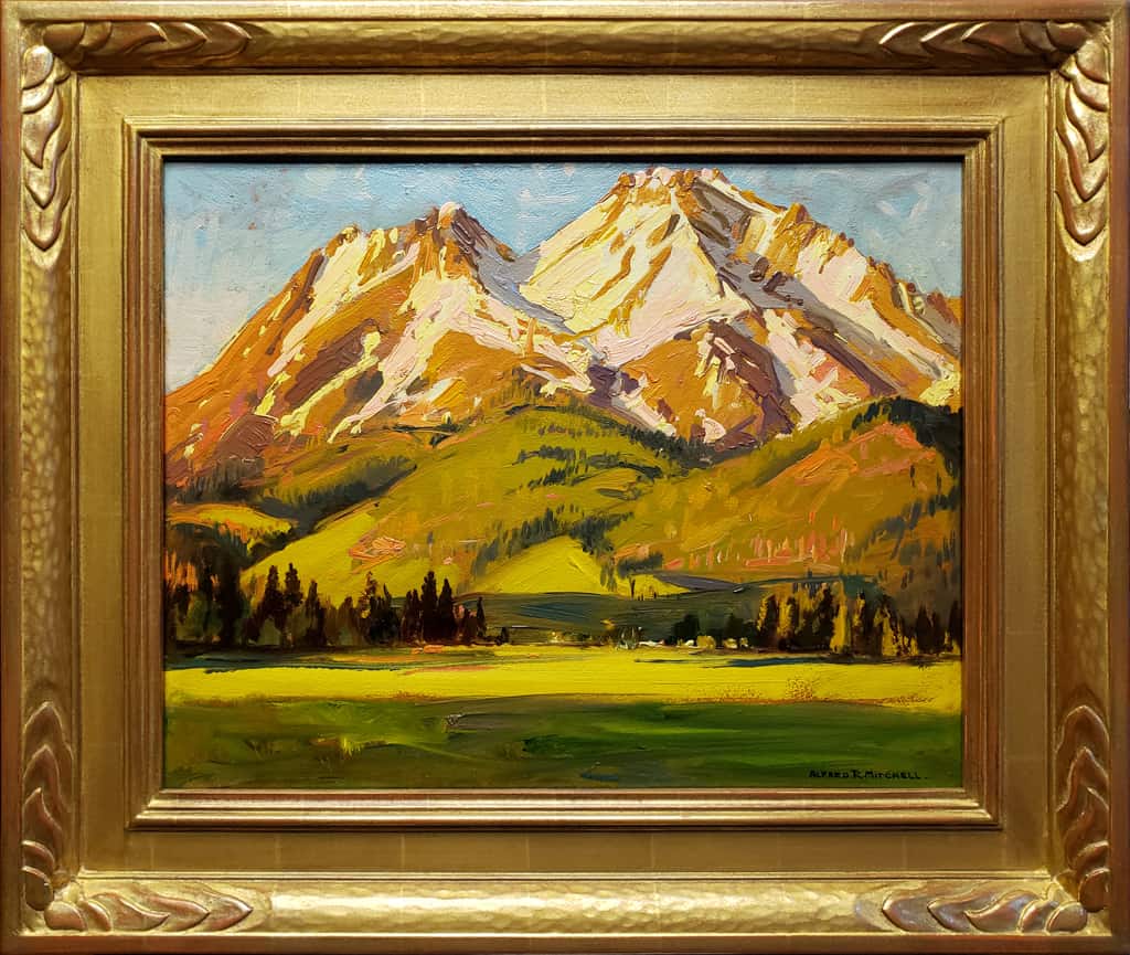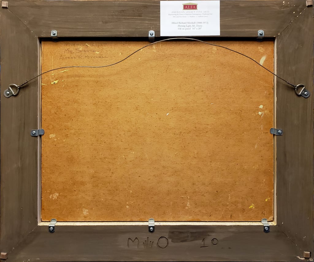 In Morning Light on Mt. Shasta, Alfred R. Mitchell masterfully captures the grandeur of one of California’s most iconic peaks, an active volcano in the state’s northern region. Measuring 16 x 20 inches—a favored size for the artist’s plein air work that fit neatly into his sketch box and was easily carried into the field—this composition reflects Mitchell’s direct, on-location approach. The scene leads the viewer’s gaze upward through a natural V-shaped corridor formed by the pine trees in the middle ground, guiding the eye toward the snow-capped summit. The mountain is rendered with bold, confident strokes in luminous tones of pink, gold, and lavender, while the foreground valley bursts with lavish greens and warm oranges. Though grounded in realism, the painting reveals Mitchell’s expressive use of color and brushwork, conveying not just the appearance but the vitality of the landscape in the first golden light of day.