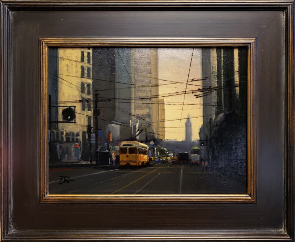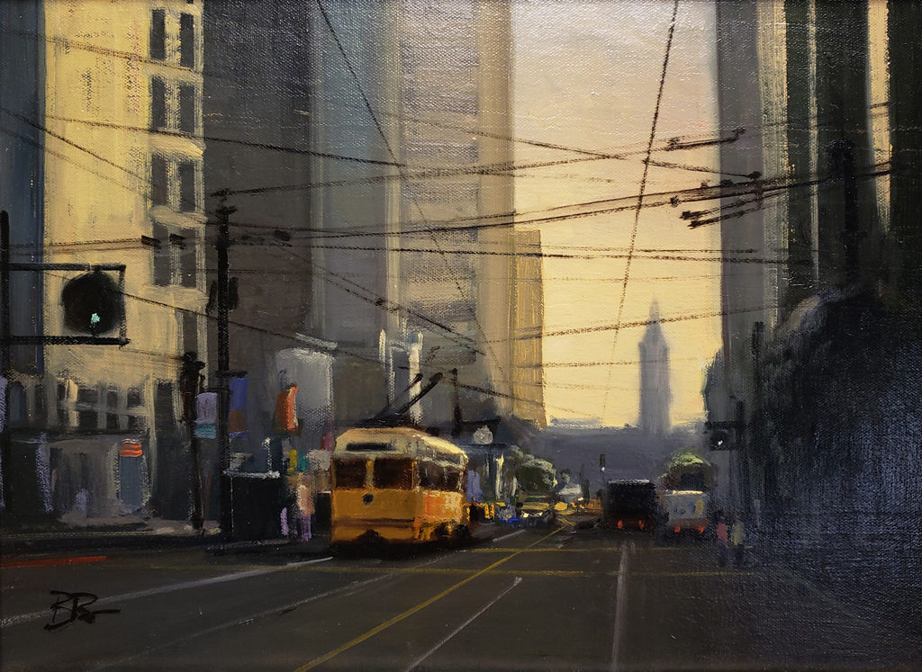 "Market St. is the main boulevard that separates the city and runs east to west from Glen Canyon Park to the [San Francisco] Bay. In the distance is the famous Ferry Building, where evacuees passed through as they escaped the fires of the 1904 Earthquake, to be ferried over to Berkeley. Now, it houses shops, restaurants and a weekly Farmers Market."