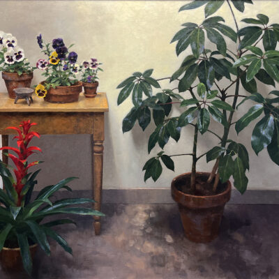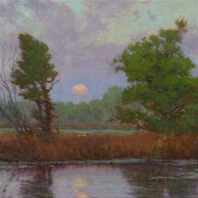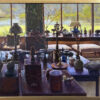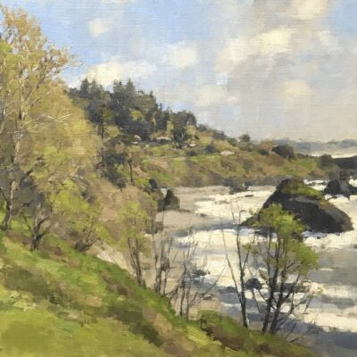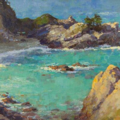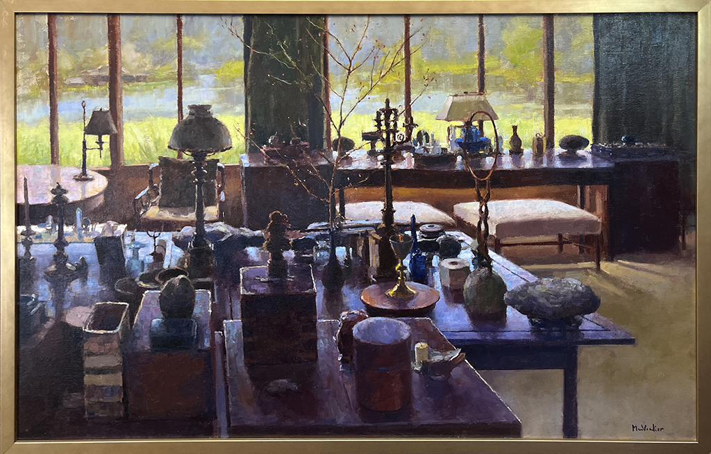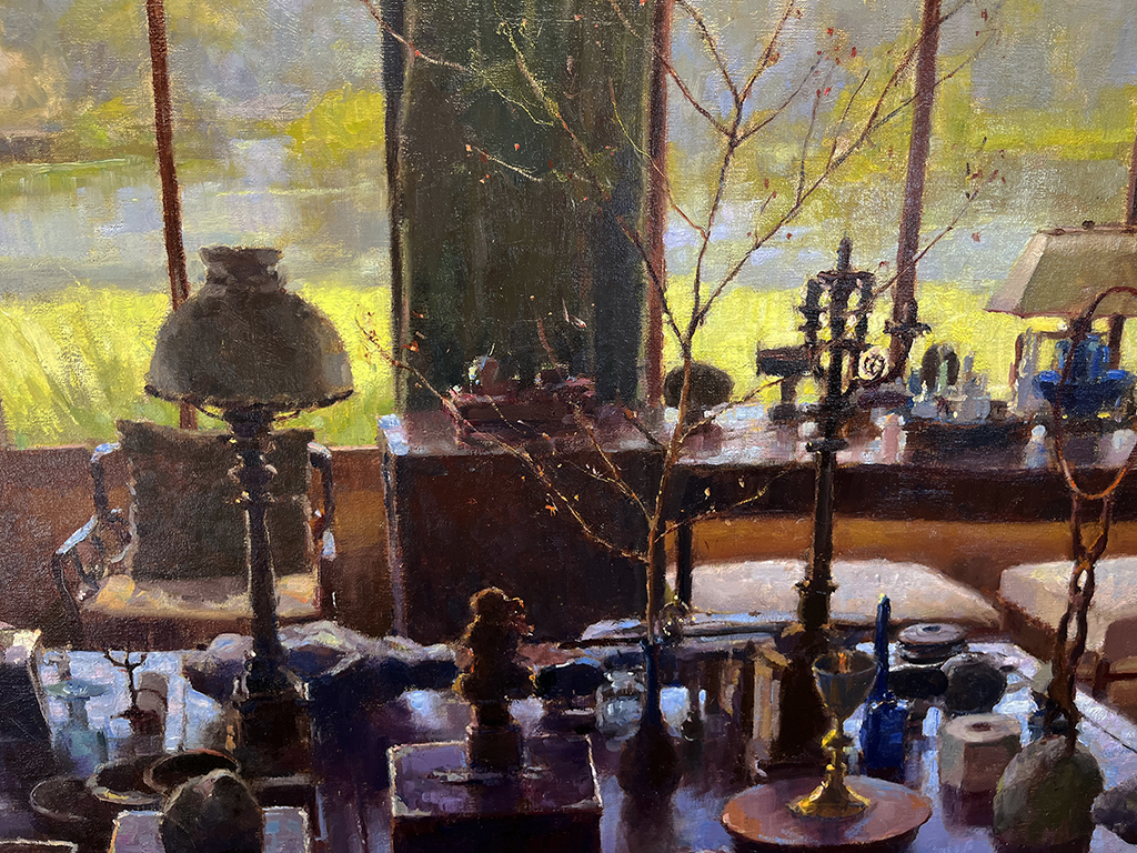 "For the past dozen years I have taught a landscape workshop on the late Morris Graves property. Morris was an important 20th Century artist that lived and worked in Humboldt County. I have spent at least two weeks each year on the property. This piece was painted in the large beautiful living room of his home. What you see are some objects that he collected over the years and the view to the lake out the north facing windows. It’s one of the most stunning properties I have ever painted. A six-acre natural lake surrounded by old growth forest. The glowing yellow on the lake is duck weed. This was truly a moving experience to set up and paint in this space."